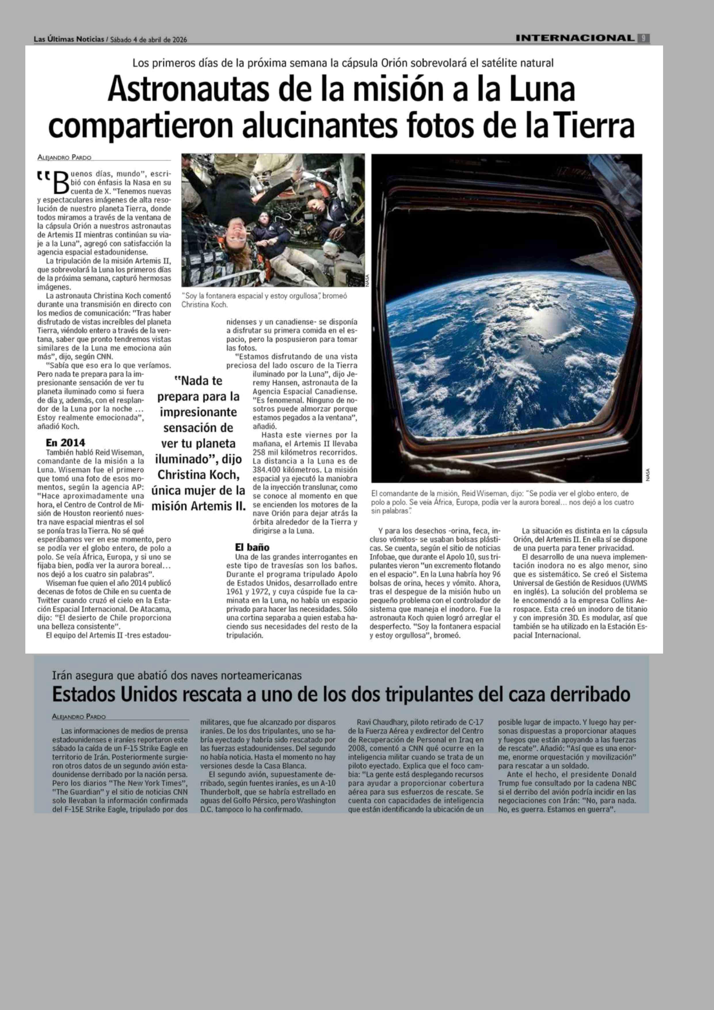 Astronautas de la misión a la Luna compartieron alucinantes fotos de la Tierra 04-04-2026 Las Últimas Noticias |