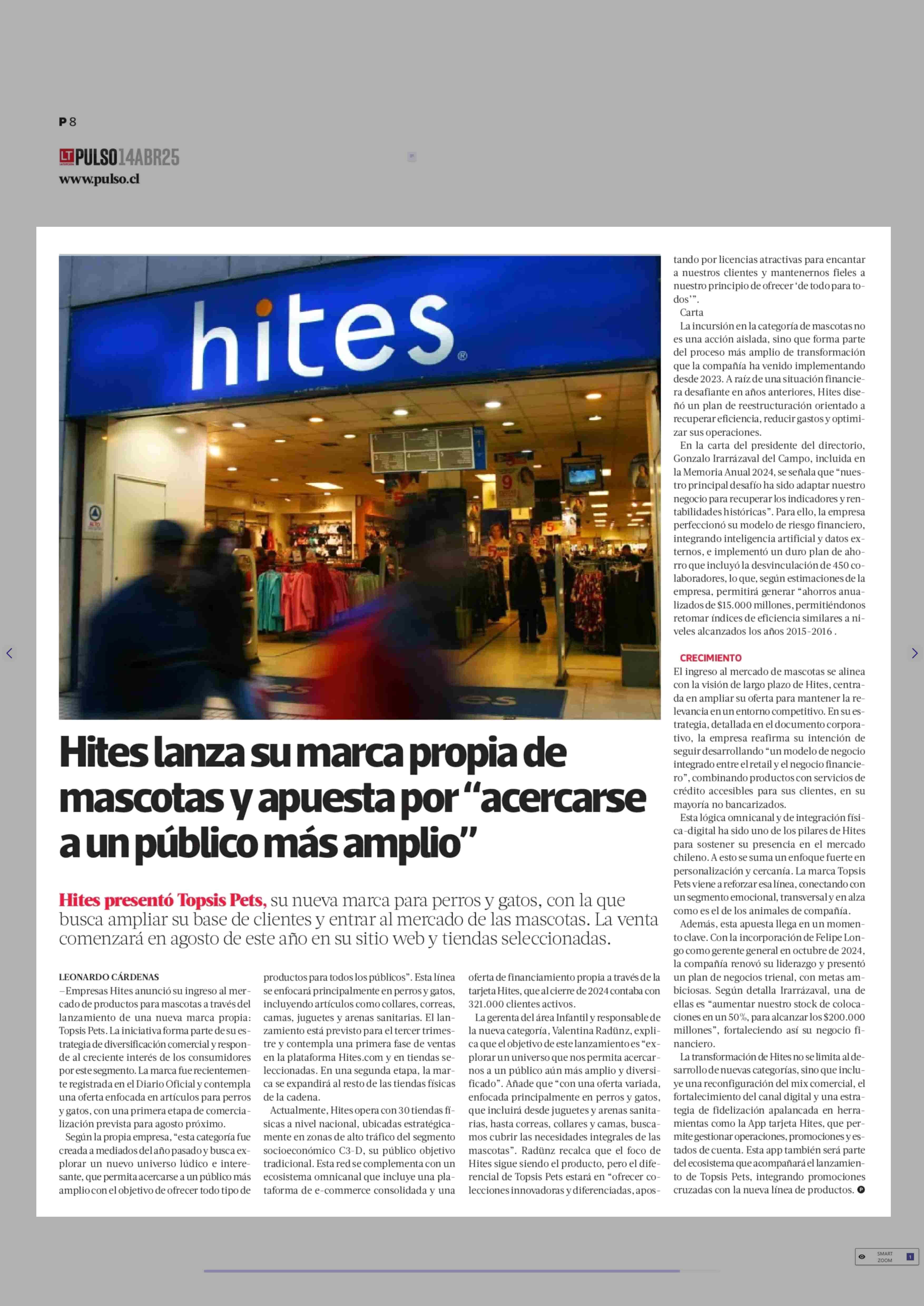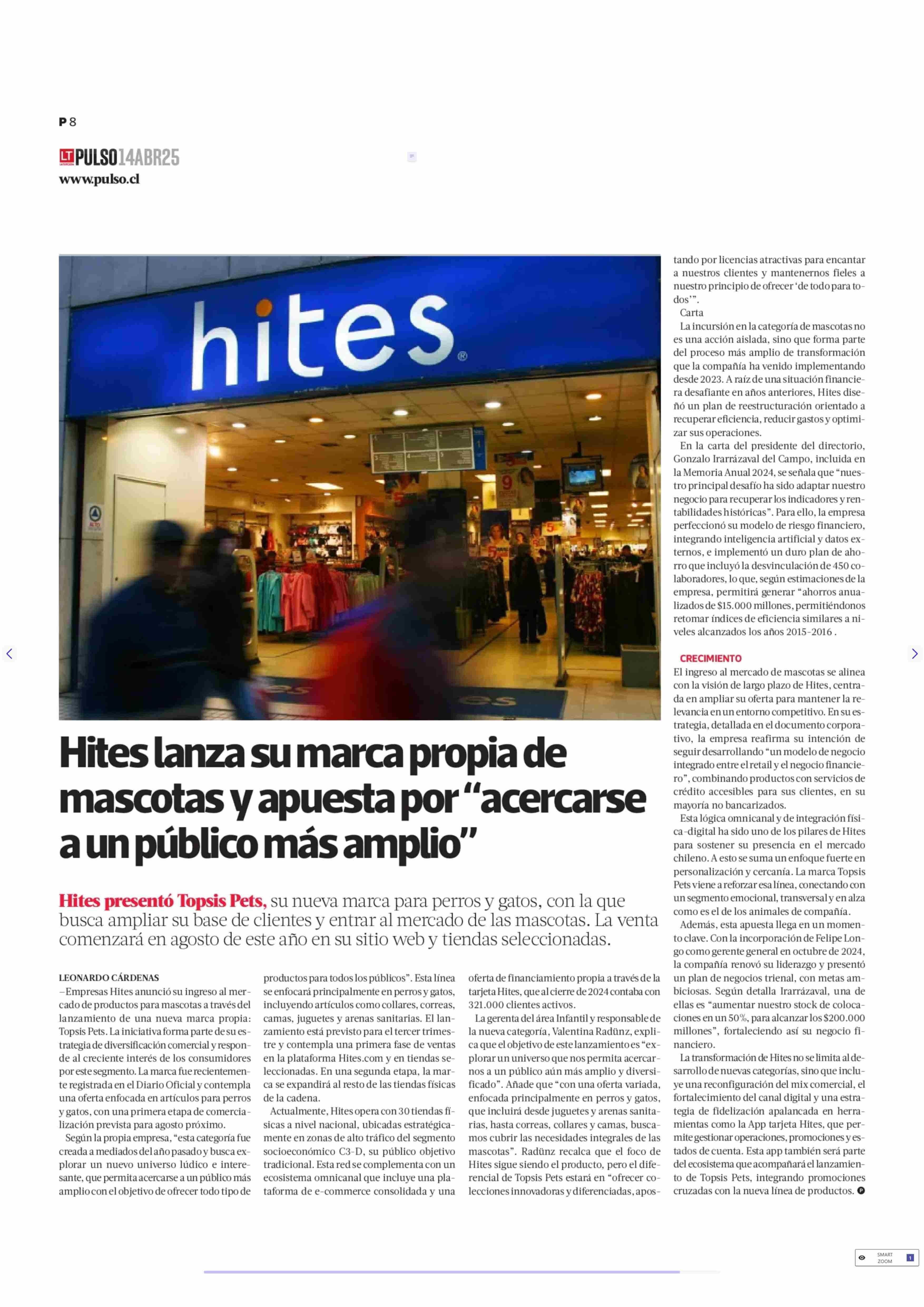Hites lanza su marca propia de mascotas y apuesta por “acercarse a un público más amplio” 14-04-2025 La Tercera |