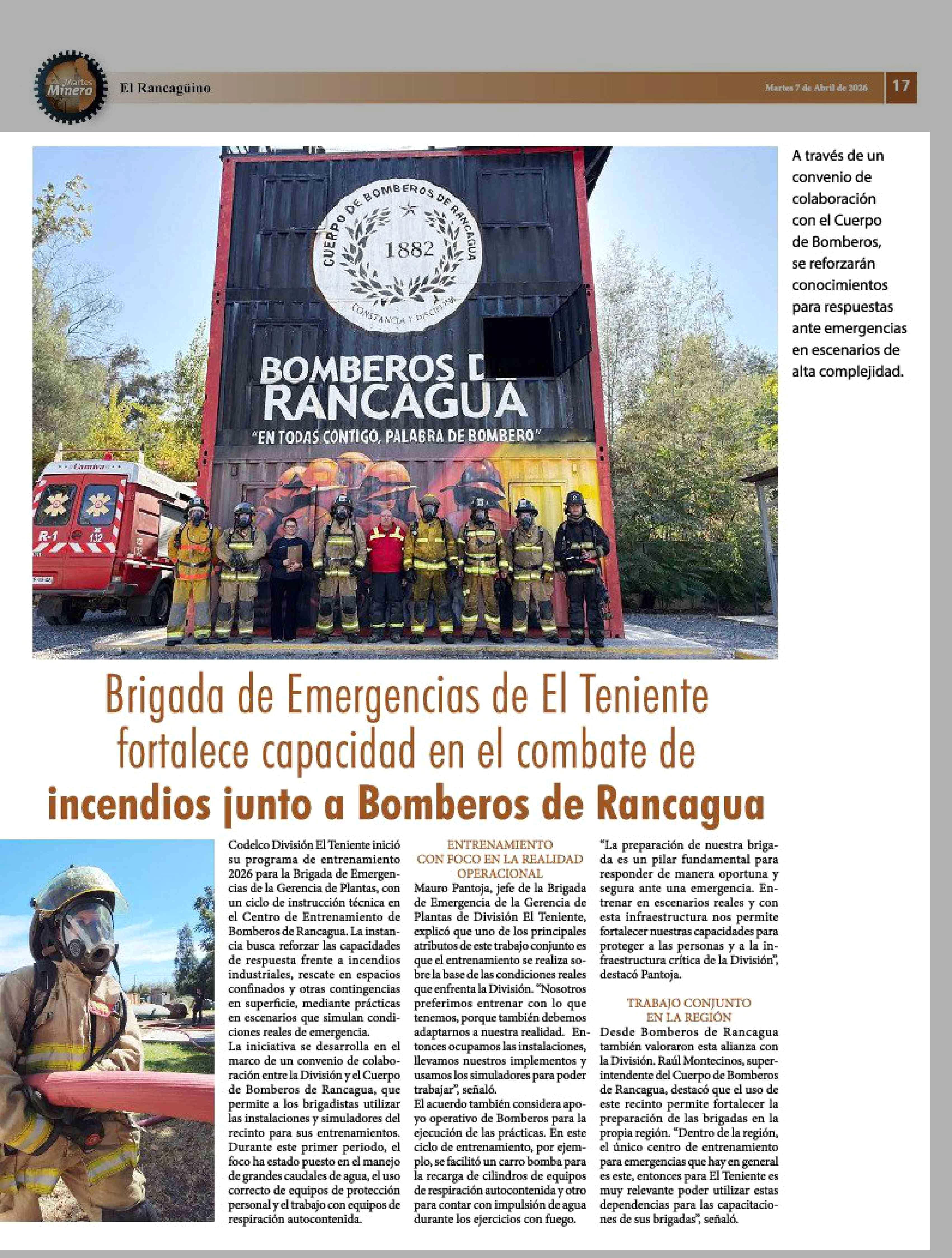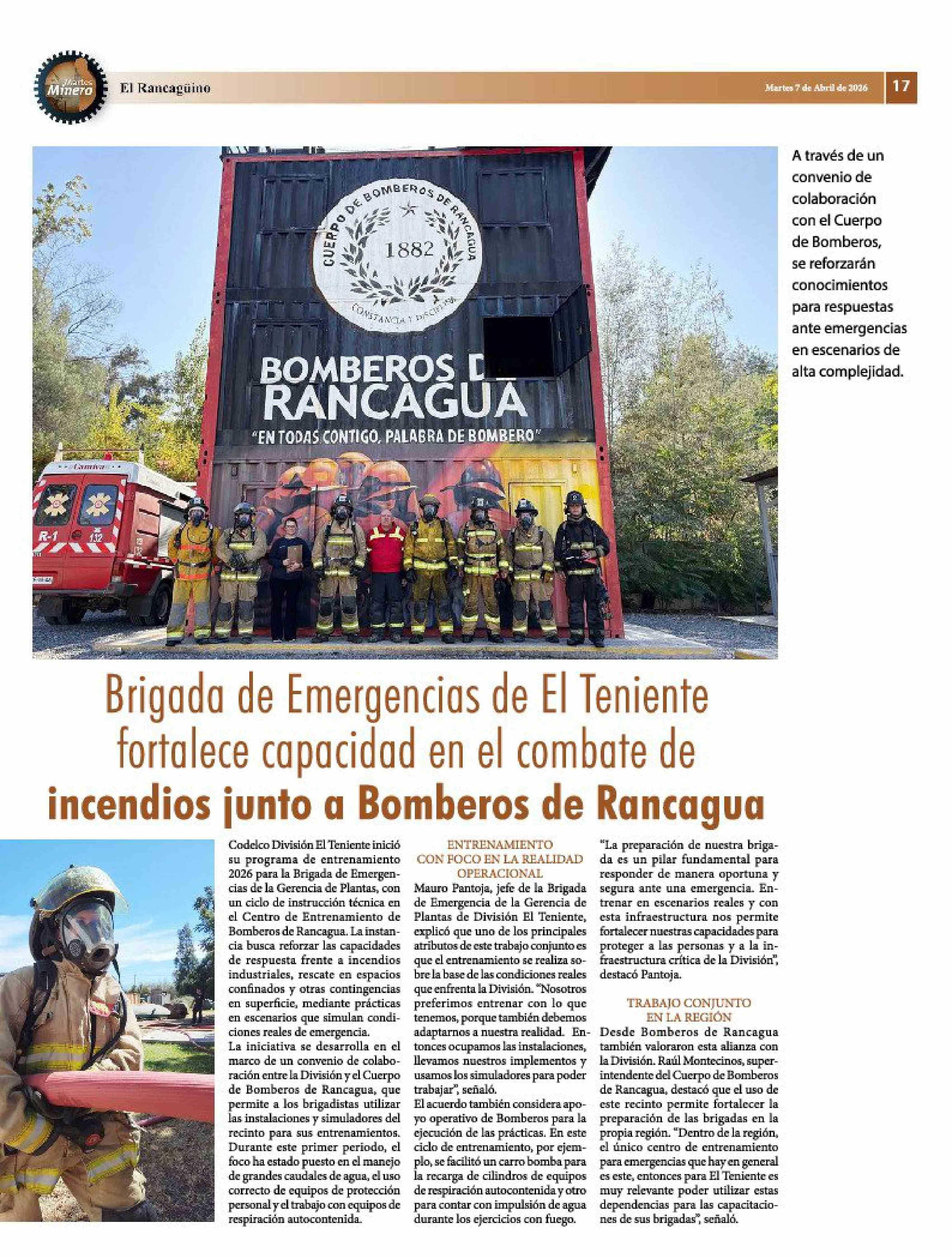 Brigada de Emergencias de El Teniente fortalece capacidad en el combate de incendios junto a Bomberos de Rancagua 07-04-2026 El Rancagüino |