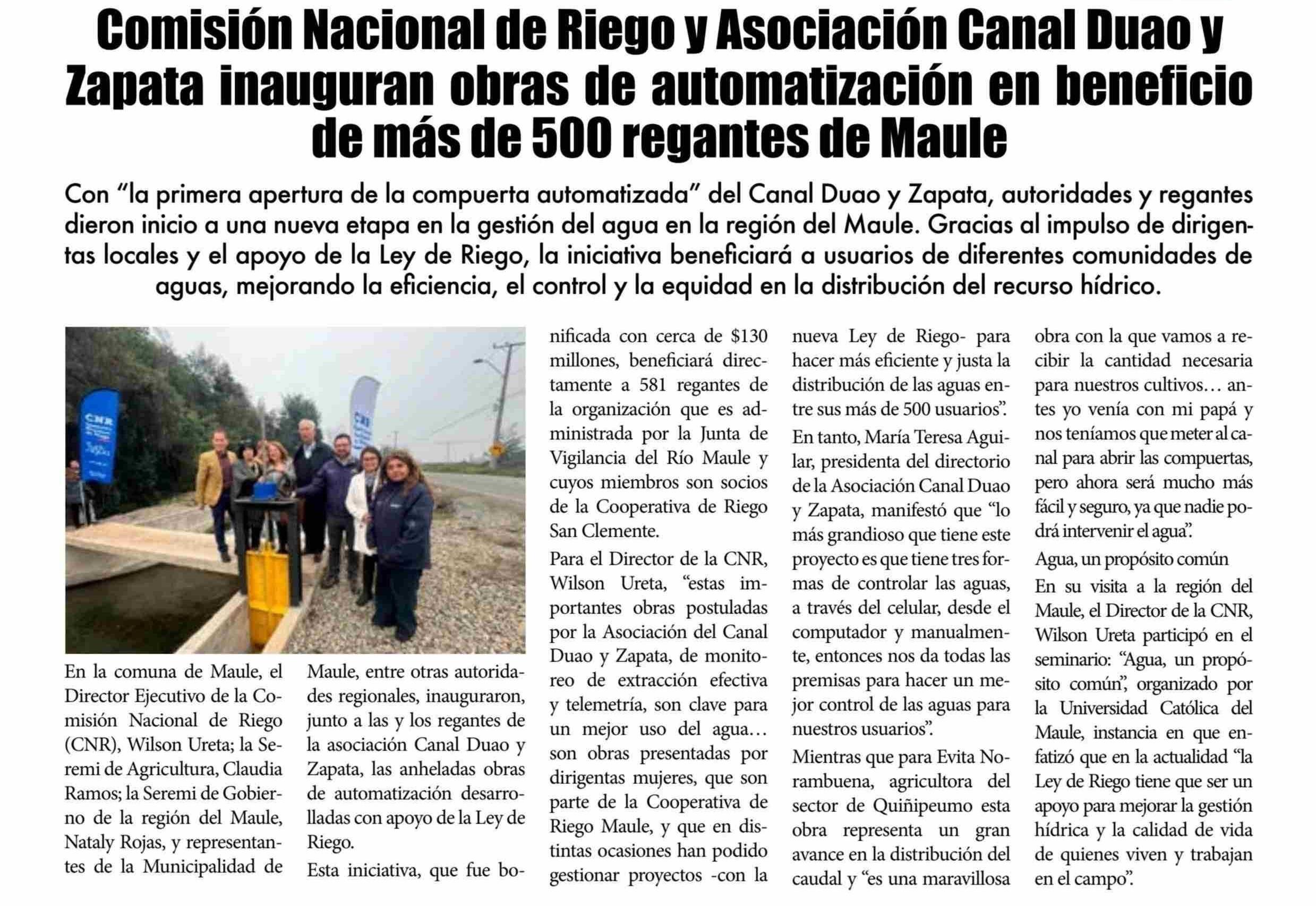 Comisión Nacional de Riego y Asociación Canal Duao y Zapata inauguran obras de automatización en beneficio de más de 500 regantes de Maule 17-05-2025 El Lector |