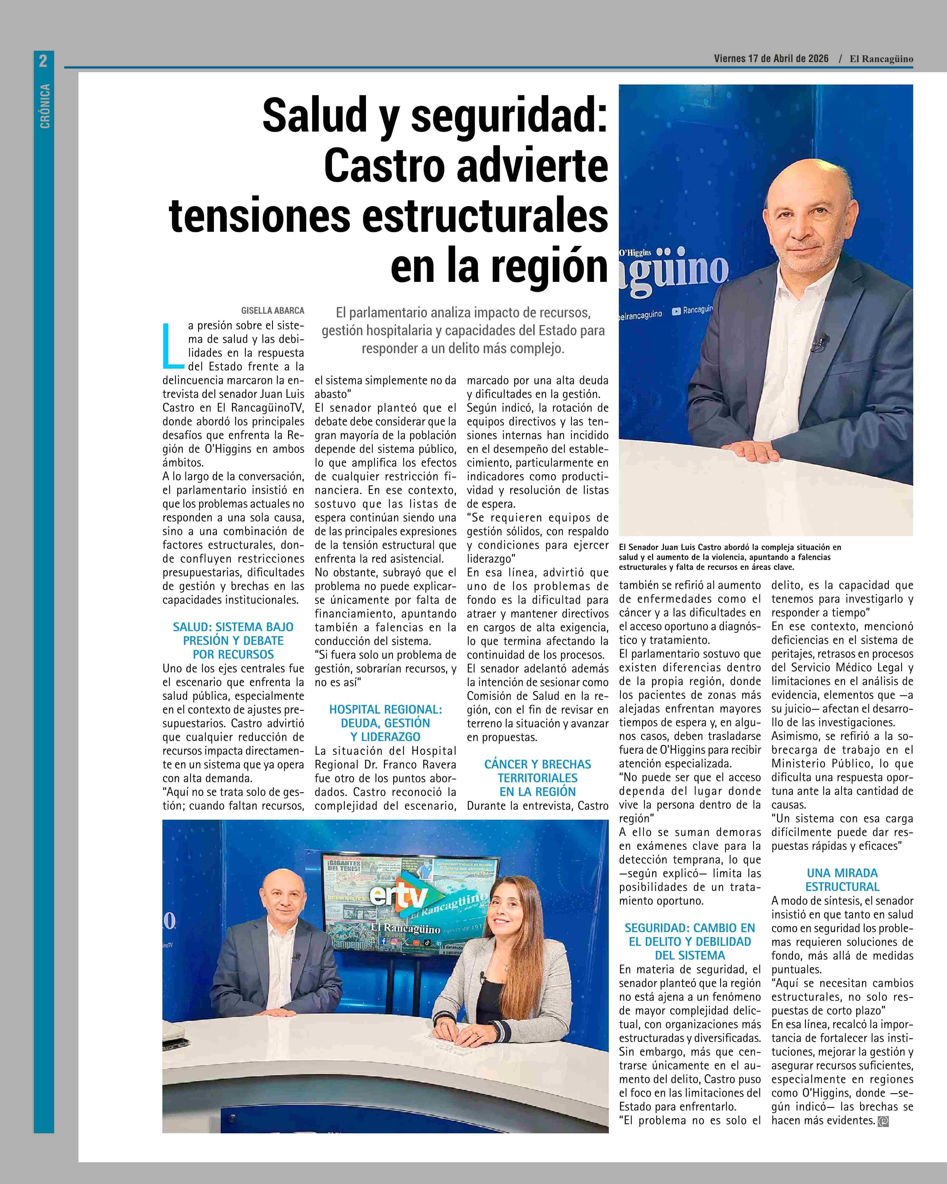 Salud y seguridad: Castro advierte tensiones estructurales en la región 17-04-2026 El Rancagüino |