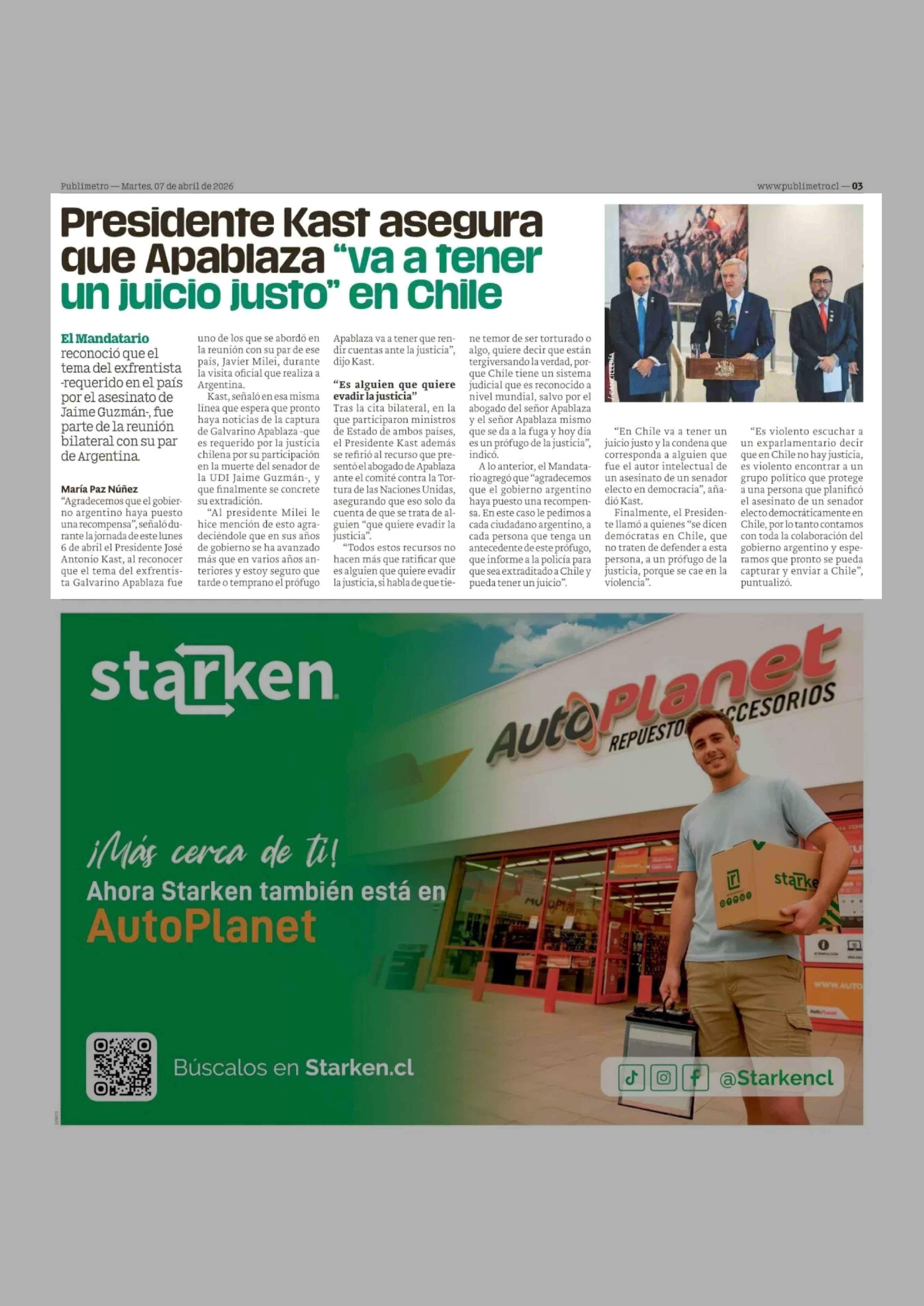 Presidente Kast asegura que Apablaza "va a tener un juicio justo" en Chile 07-04-2026 Publimetro |