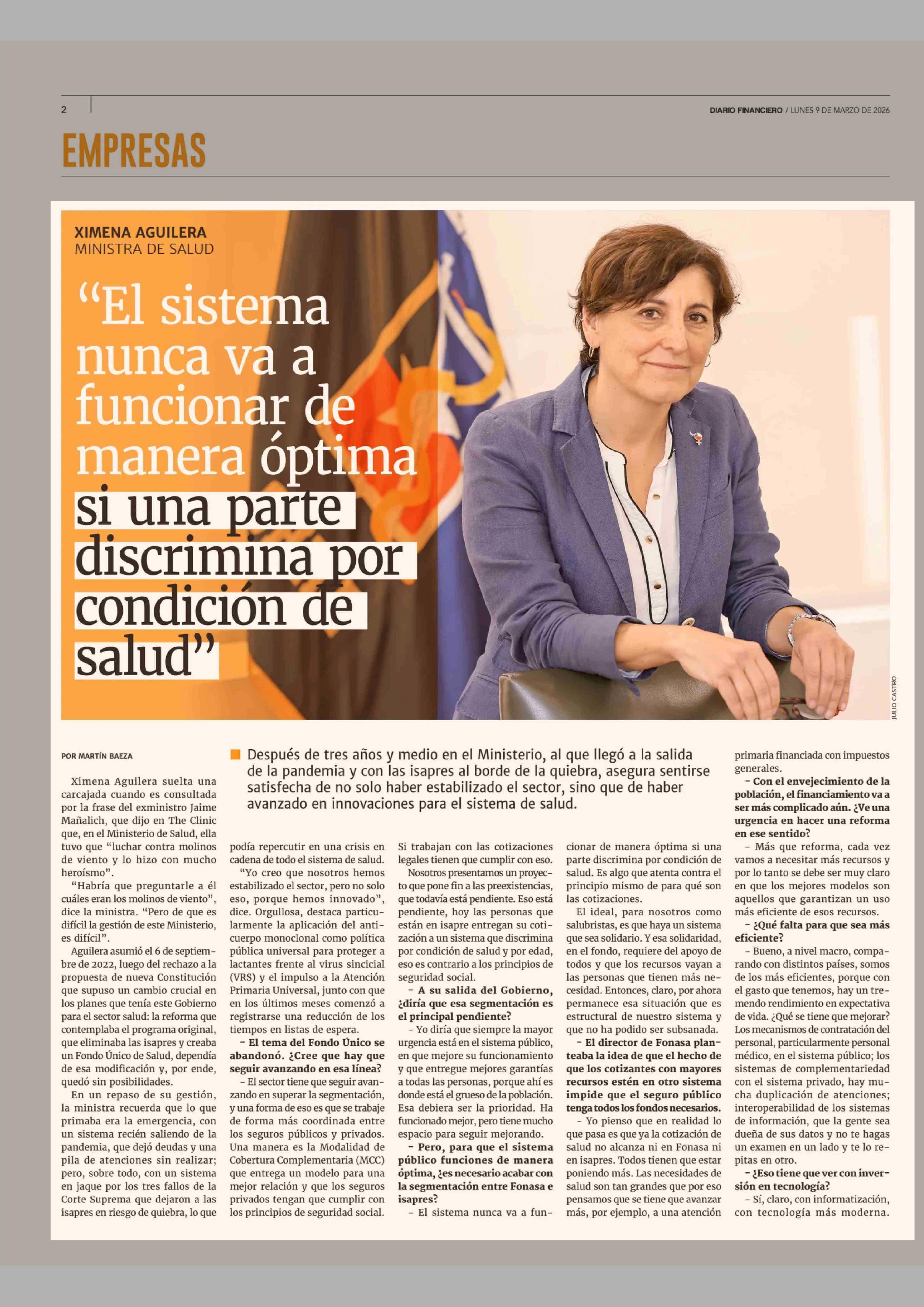 "El sistema nunca va a funcionar de manera optima si una parte discrimina por condición de salud" 09-03-2026 Diario Financiero |