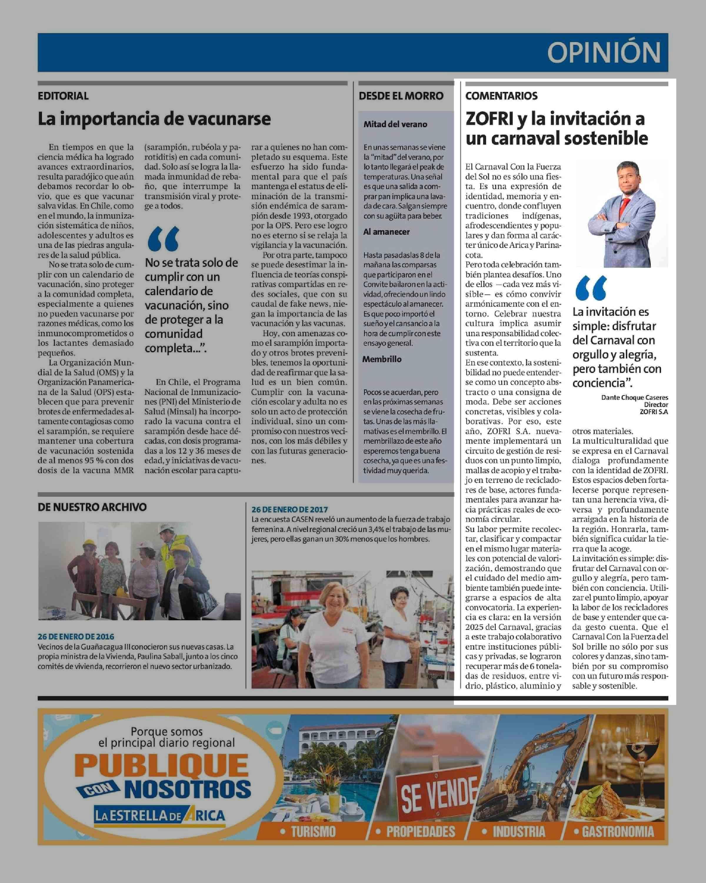 Columnas de Opinión: ZOFRI y la invitación a un carnaval sostenible 26-01-2026 La Estrella de Arica |