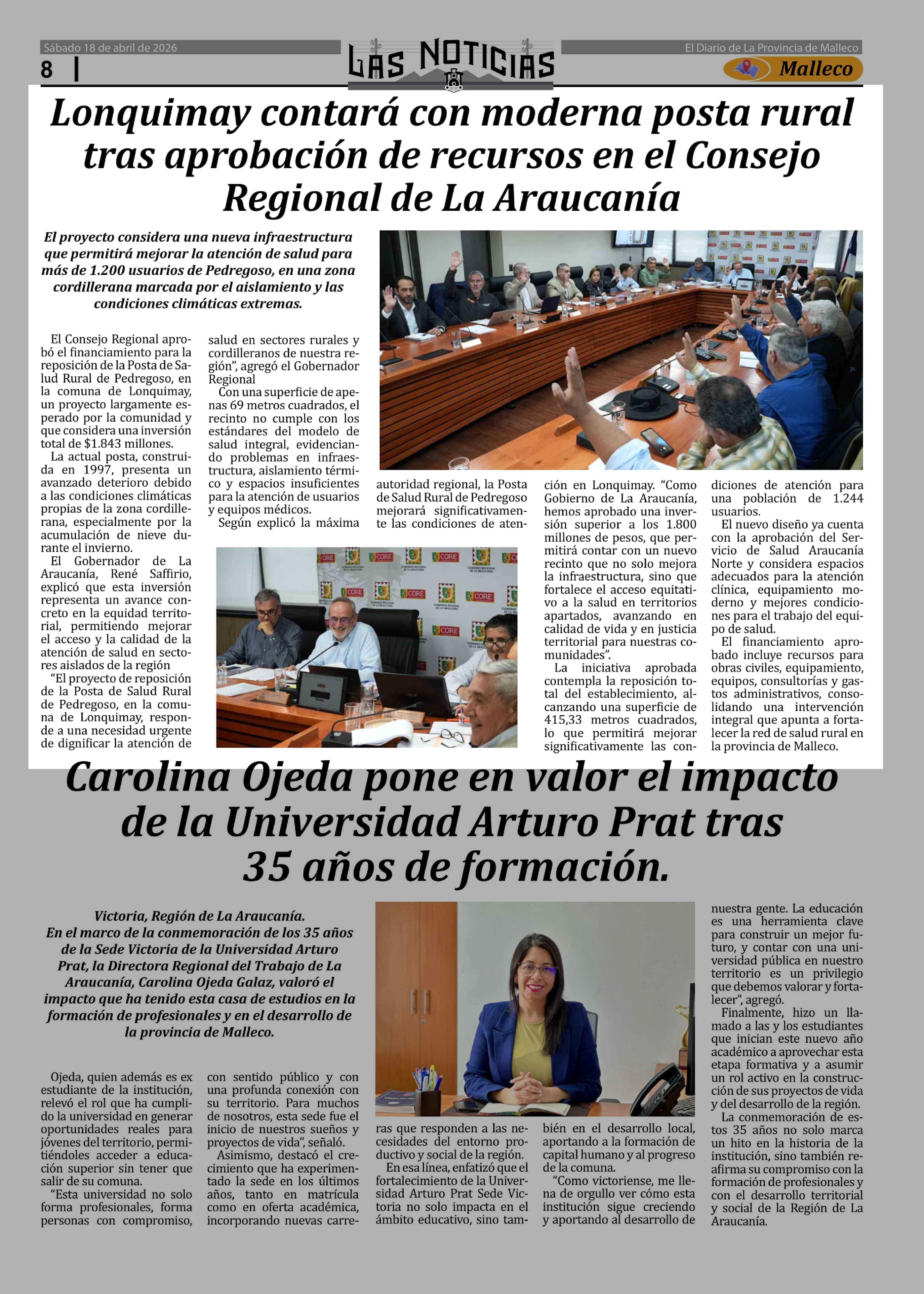 Lonquimay contará con moderna posta rural tras aprobación de recursos en el Consejo Regional de La Araucanía 18-04-2026 Las Noticias |