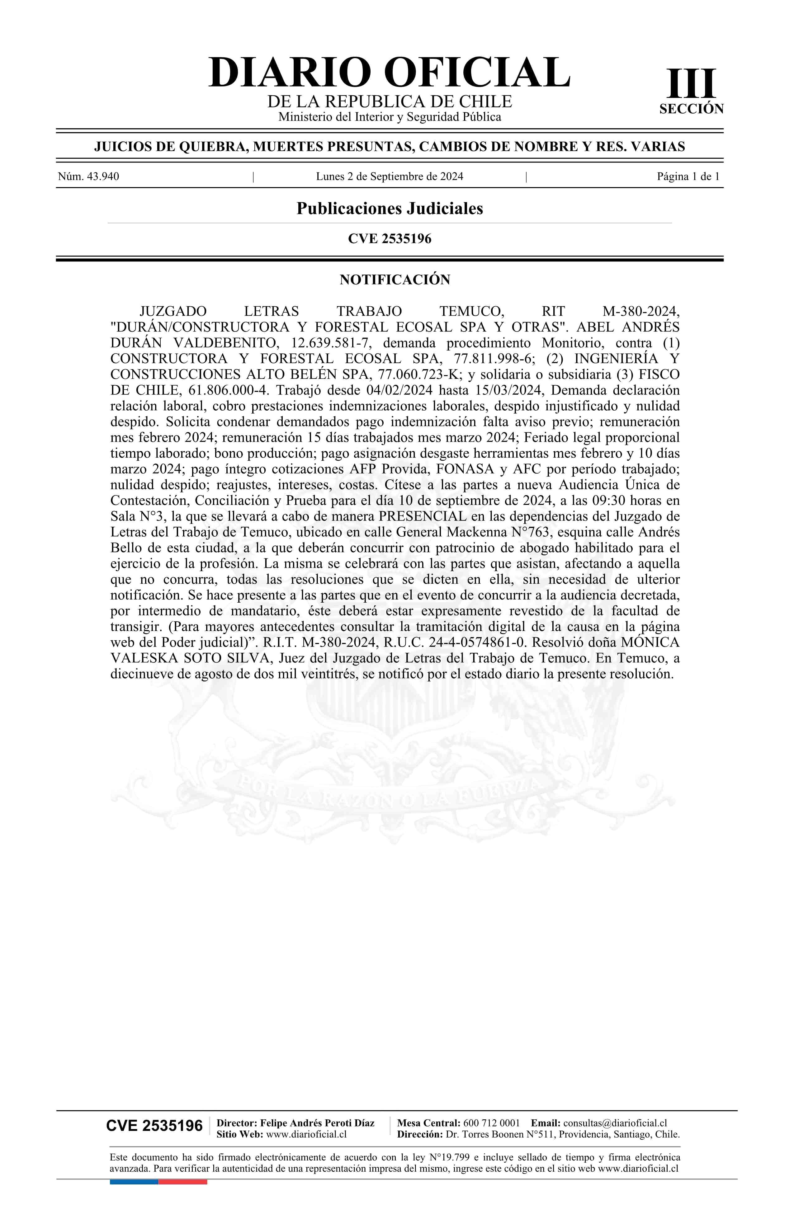 Durán - Constructora y Forestal Ecosal SpA y otras 02-09-2024 Diario Oficial Edición Electrónica |