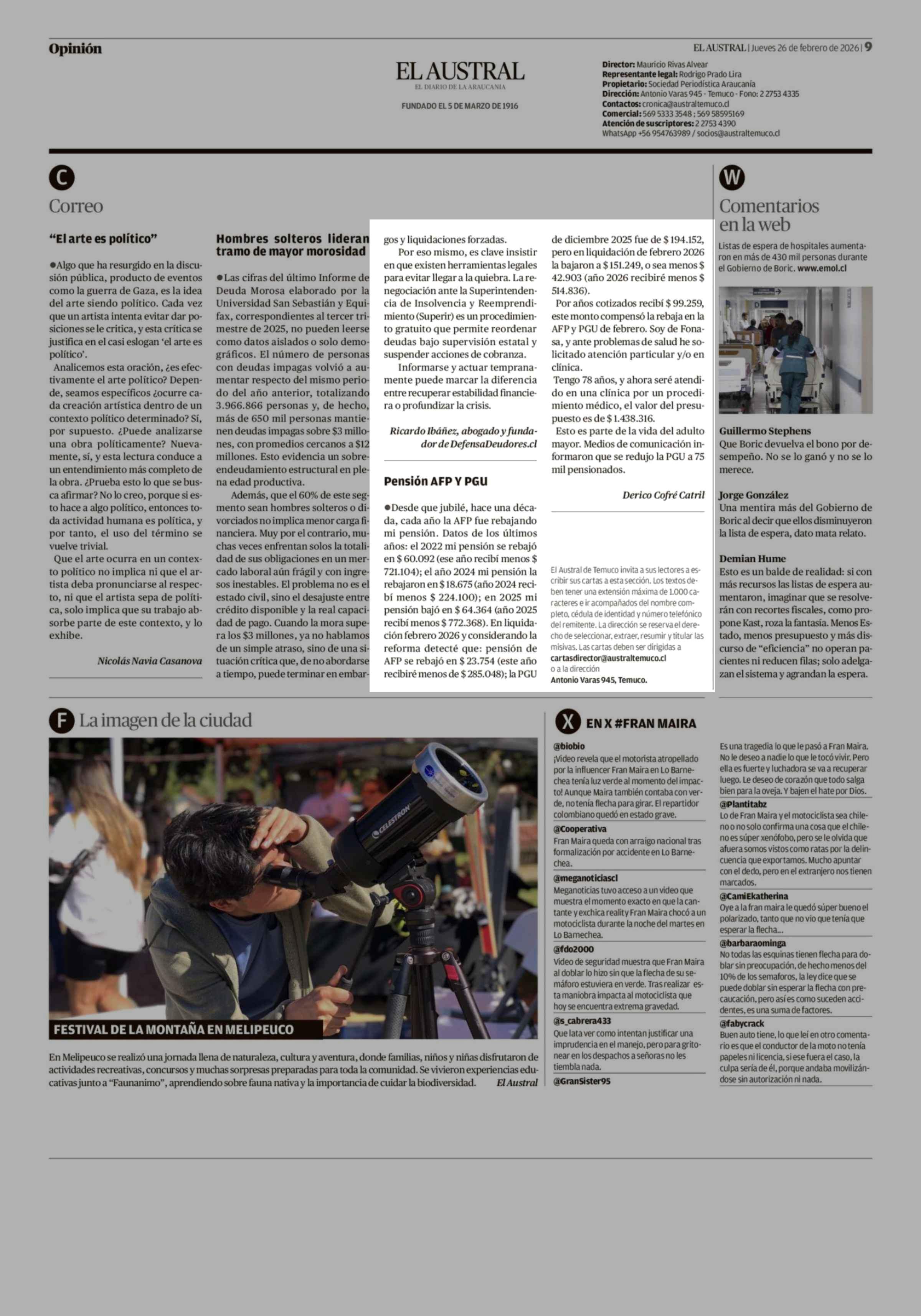 Cartas: Pensión AFP Y PGU 26-02-2026 El Austral de la Araucanía |