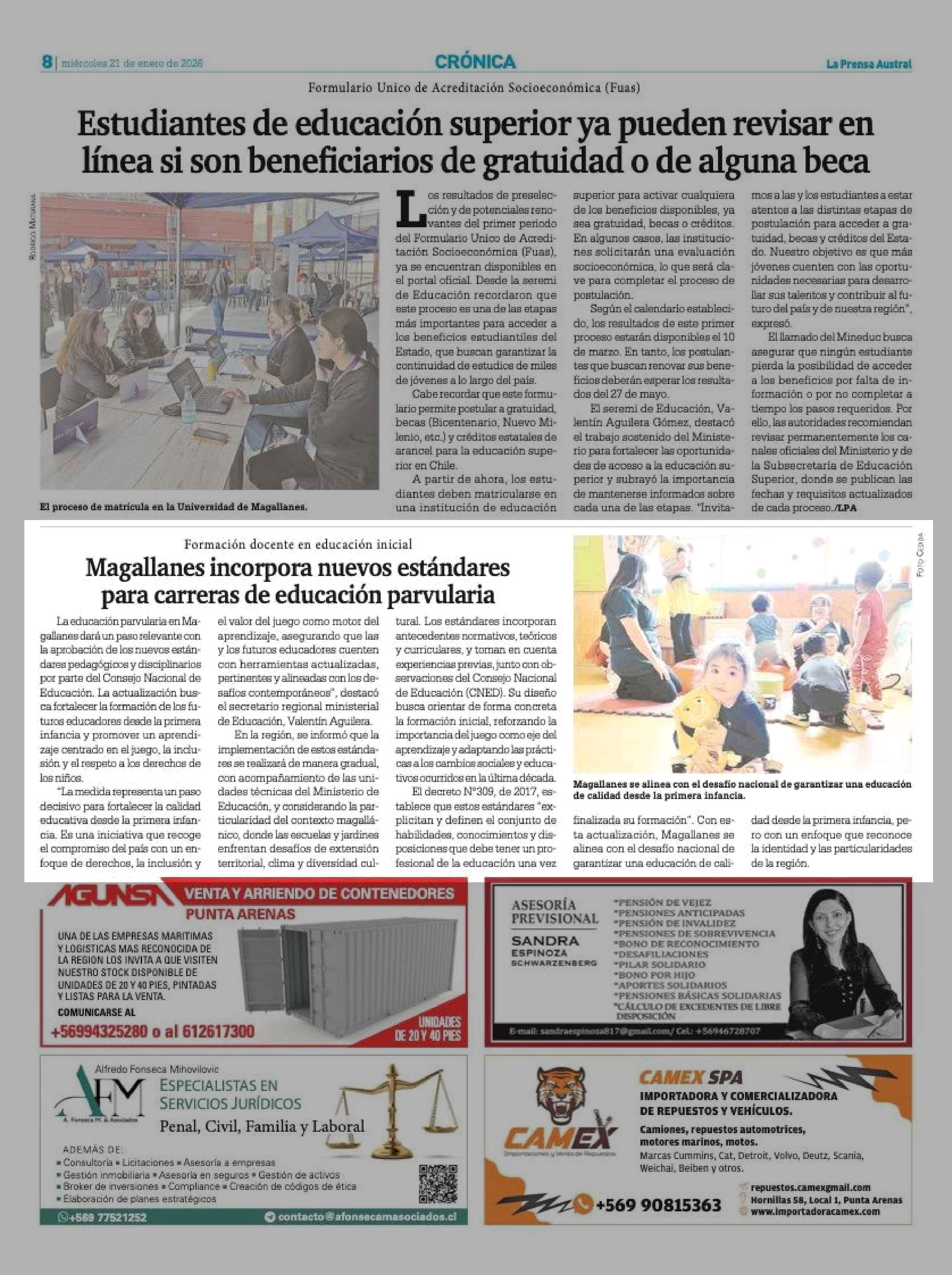Magallanes incorpora nuevos estándares para carreras de educación parvularia 21-01-2026 La Prensa Austral |