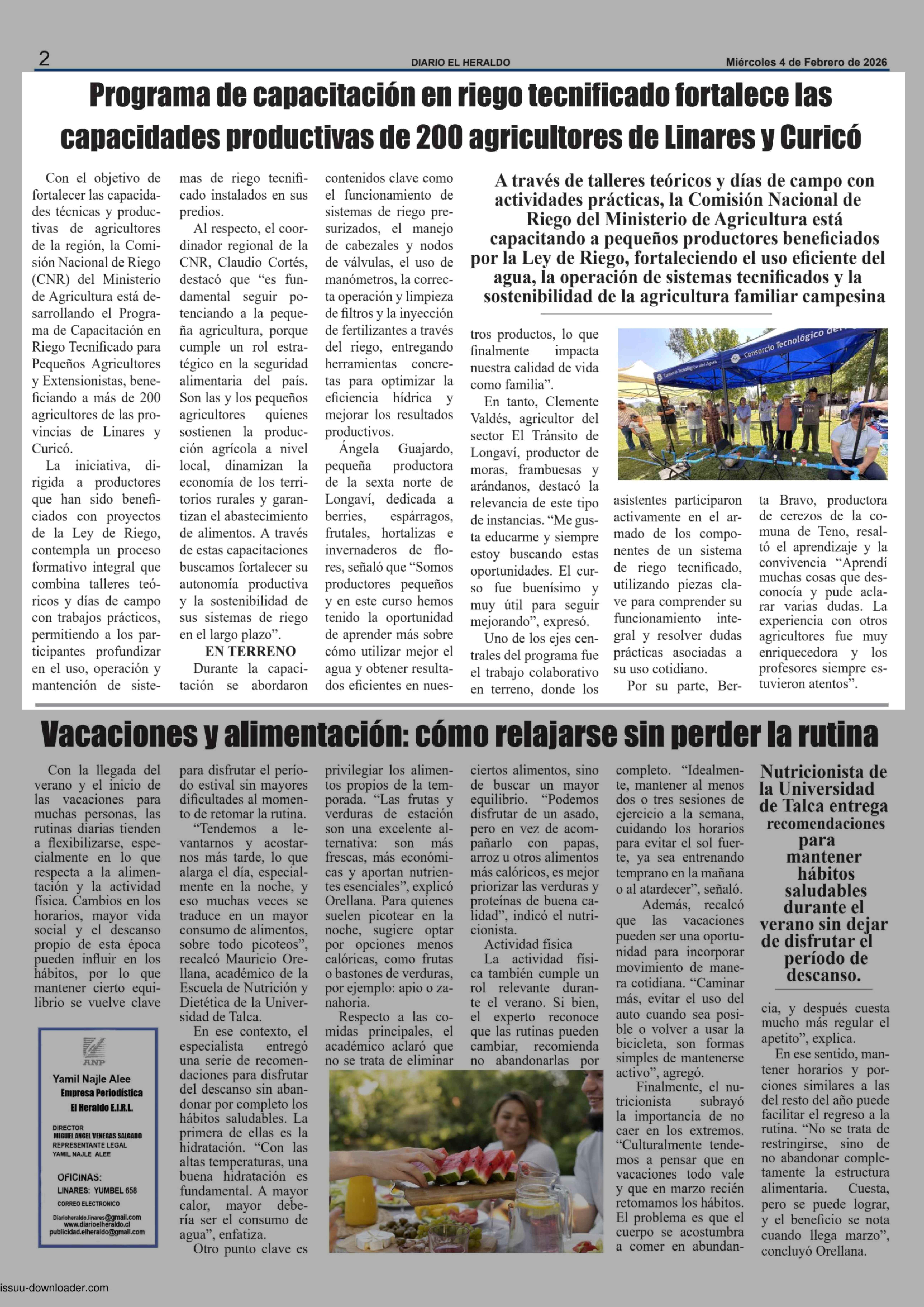 Programa de capacitación en riego tecnificado fortalece las capacidades productivas de 200 agricultores de Linares y Curicó 04-02-2026 El Heraldo |