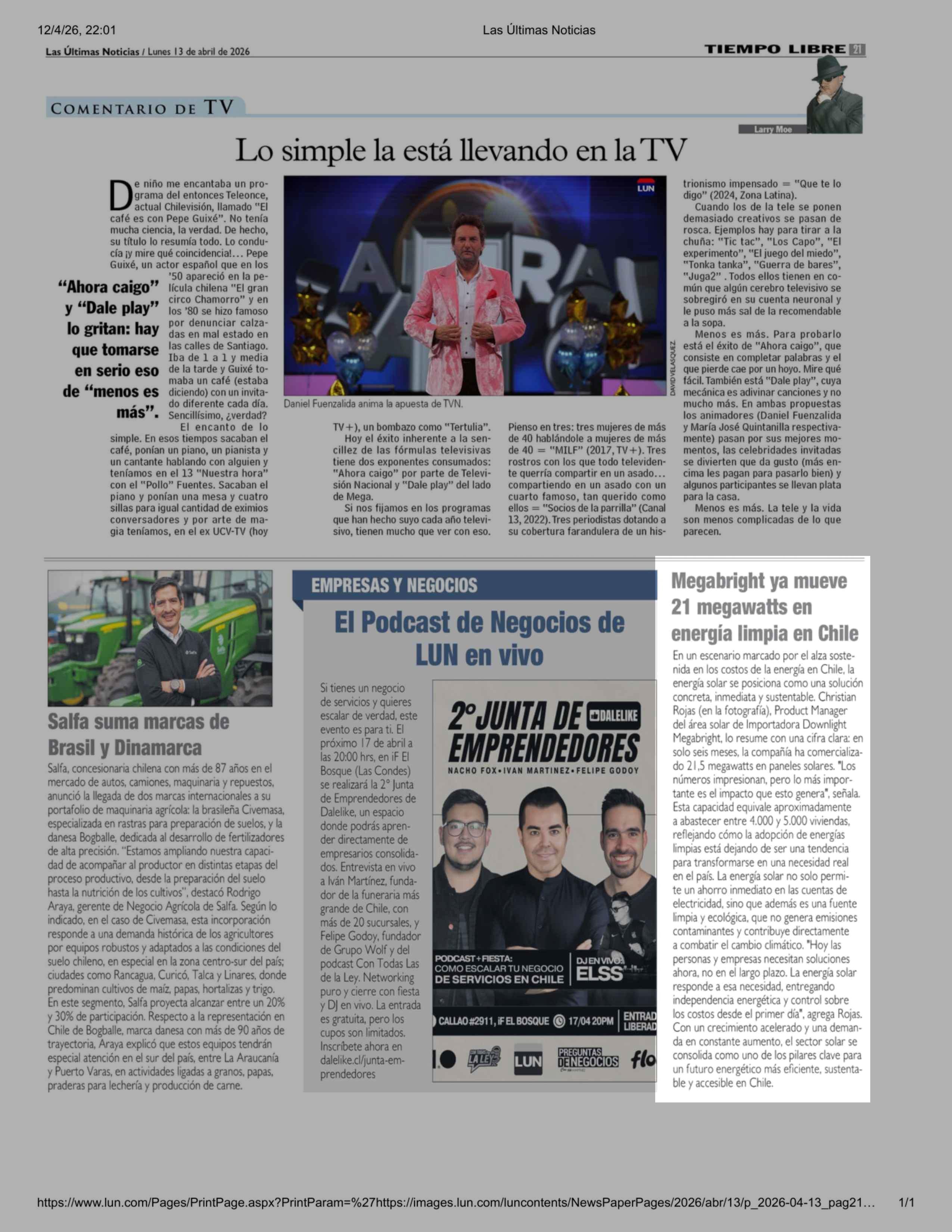 Megabright ya mueve 21 megawatts en energía limpia en Chile 13-04-2026 Las Últimas Noticias |