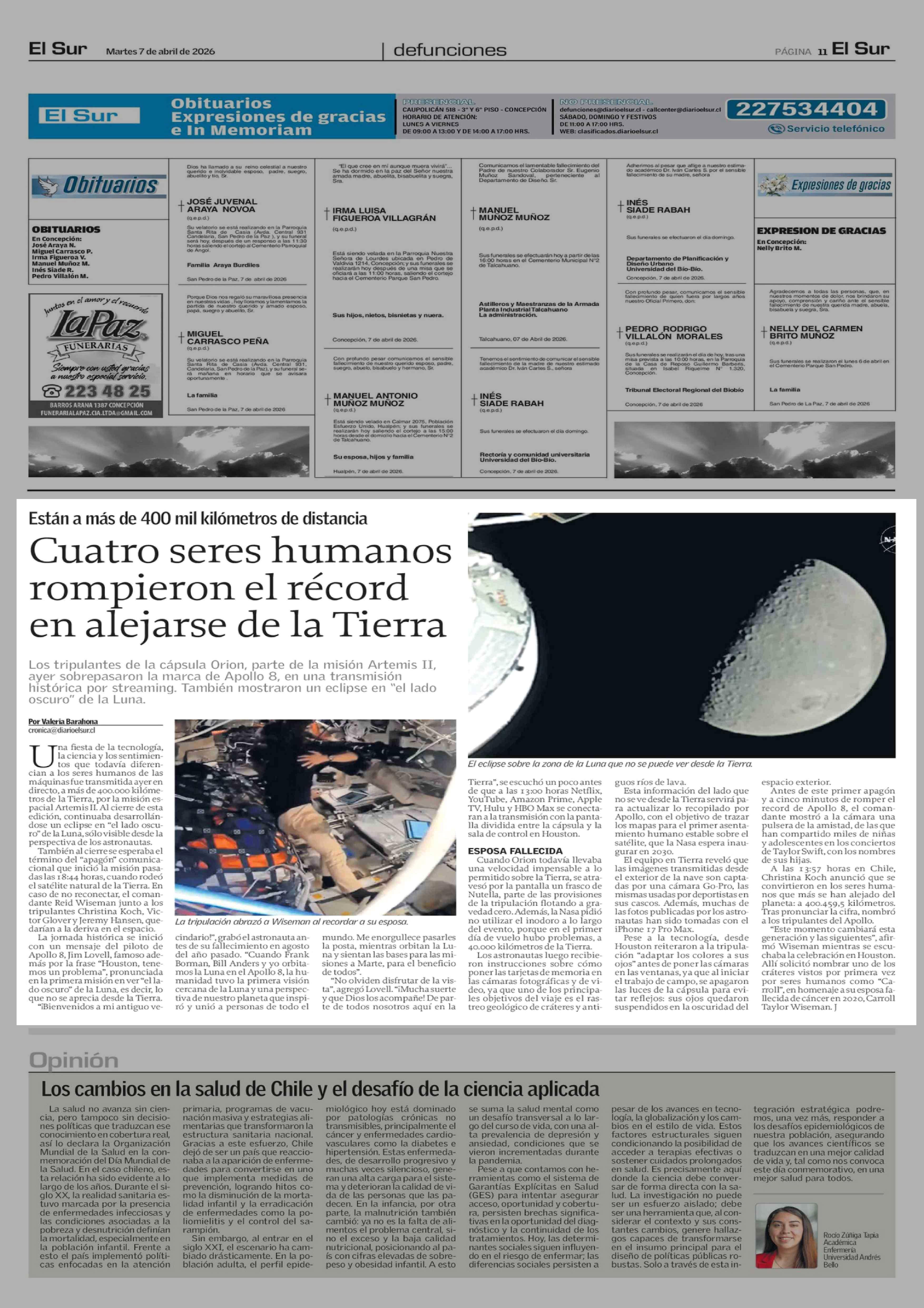Cuatro seres humanos rompieron el récord en alejarse de la Tierra 07-04-2026 El Sur |