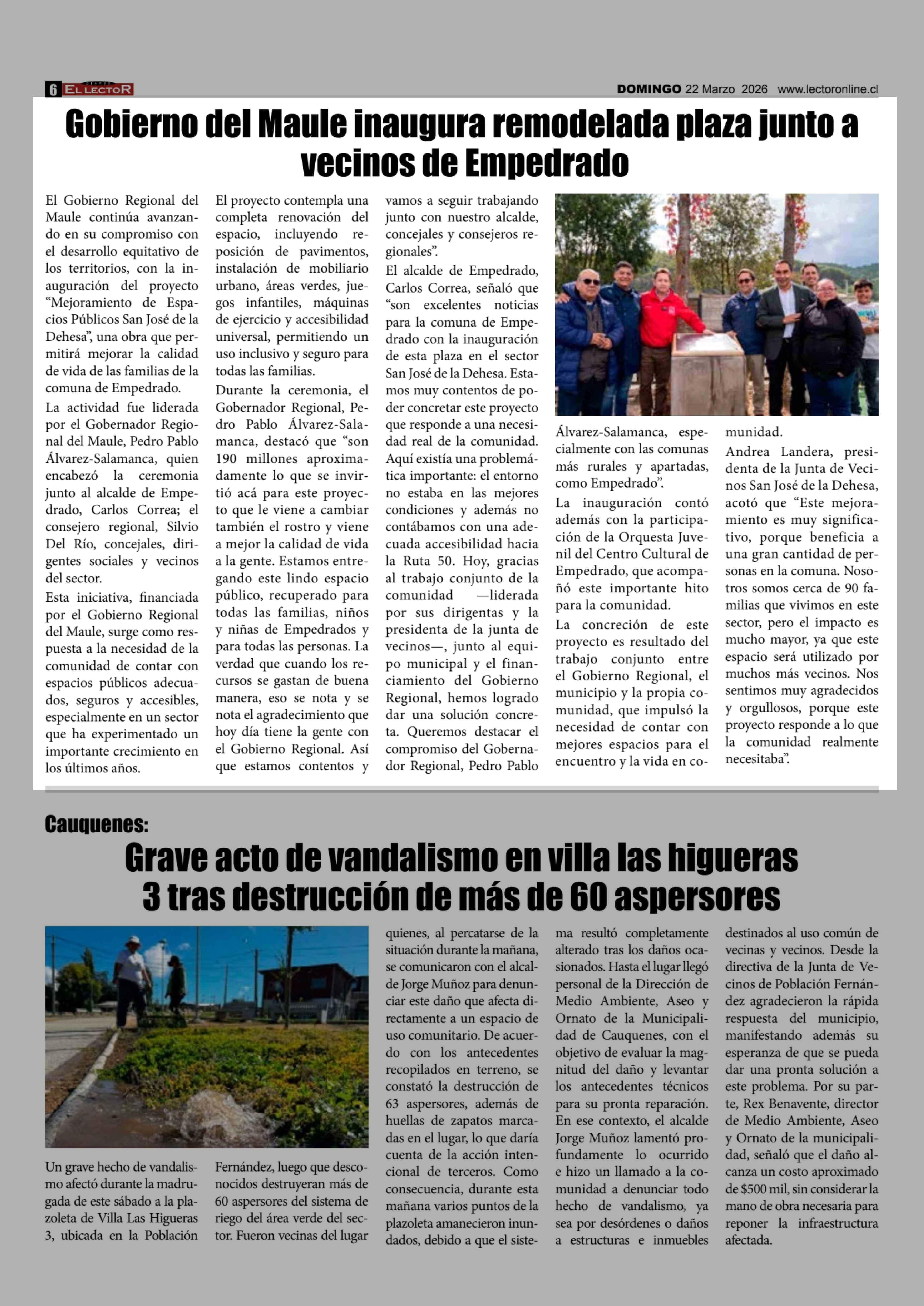 Gobierno del Maule inaugura remodelada plaza junto a vecinos de Empedrado 22-03-2026 El Lector |