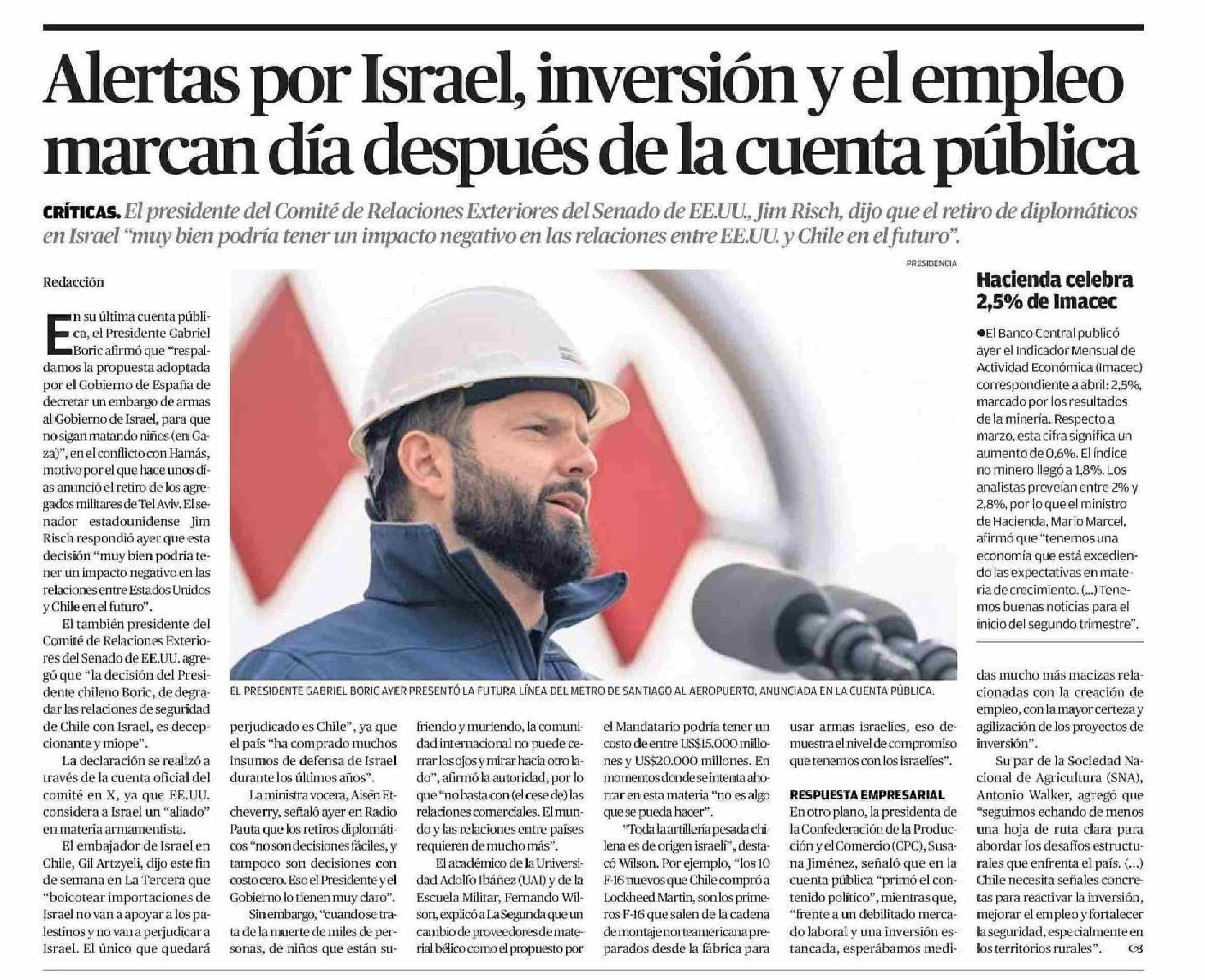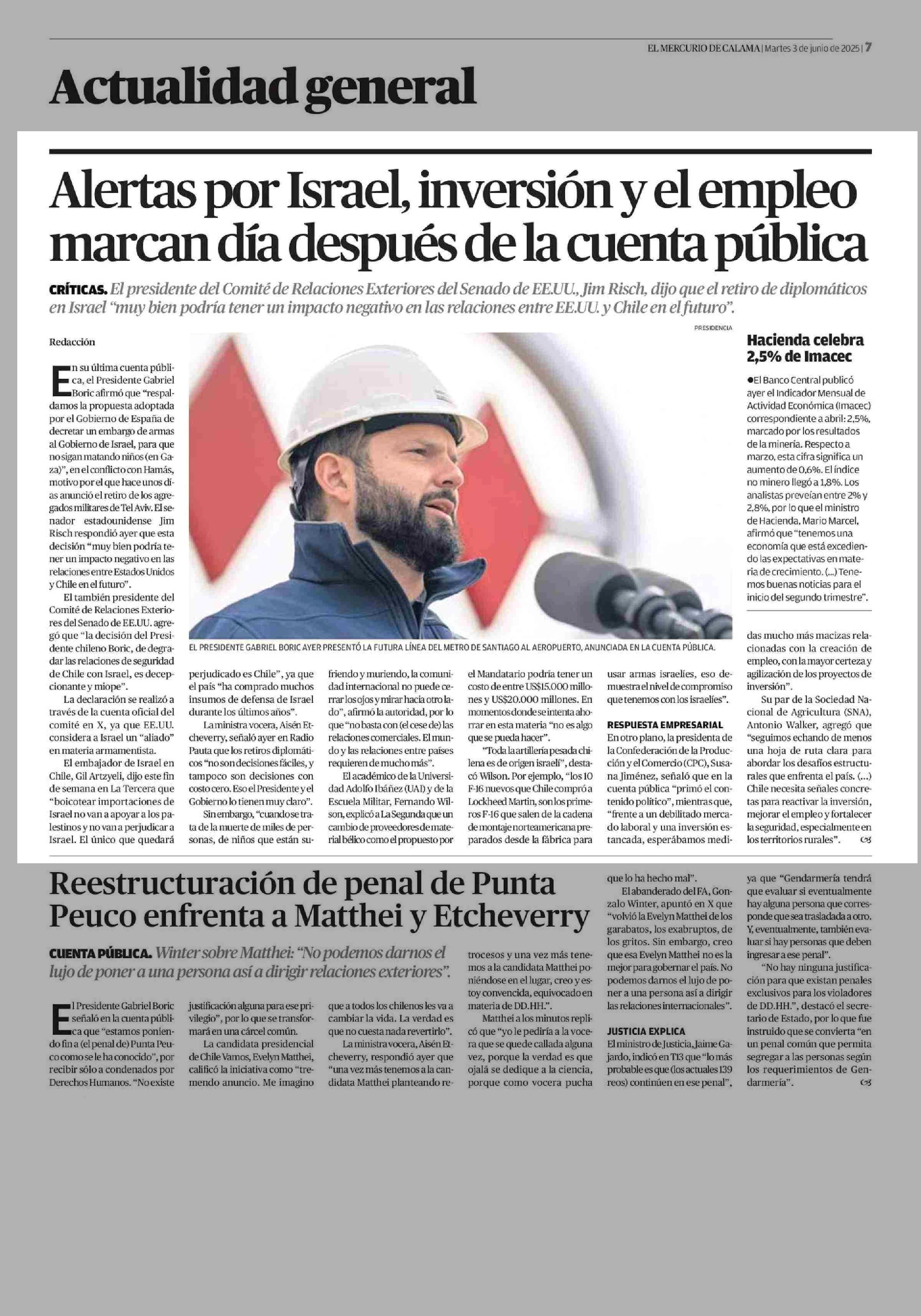 Alertas por Israel, inversión y el empleo marcan día después de la cuenta pública 03-06-2025 El Mercurio de Calama |