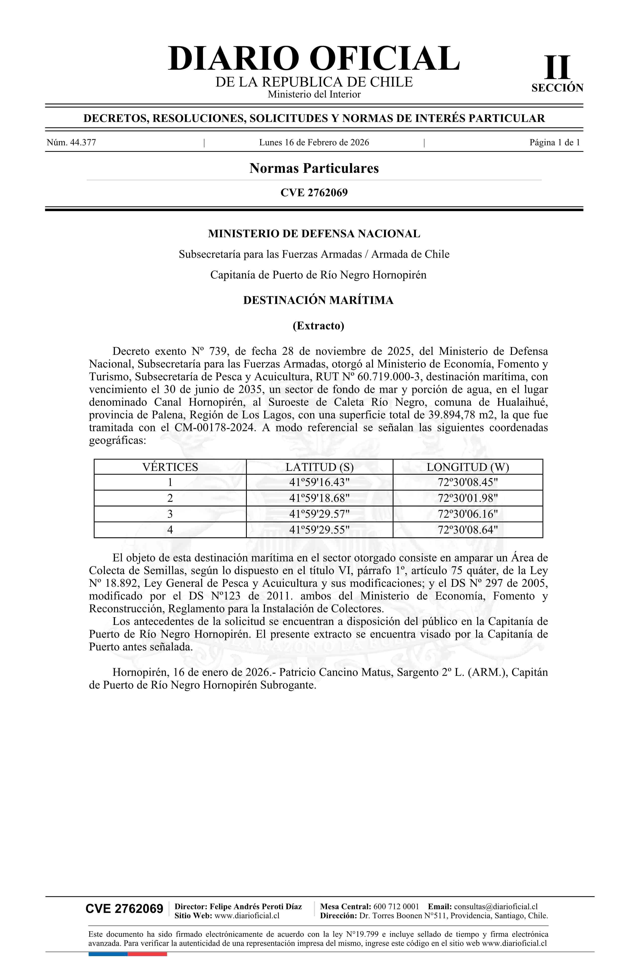 Extracto de decreto exento número 739, de 2025.- Destinación marítima 16-02-2026 Diario Oficial Edición Electrónica |