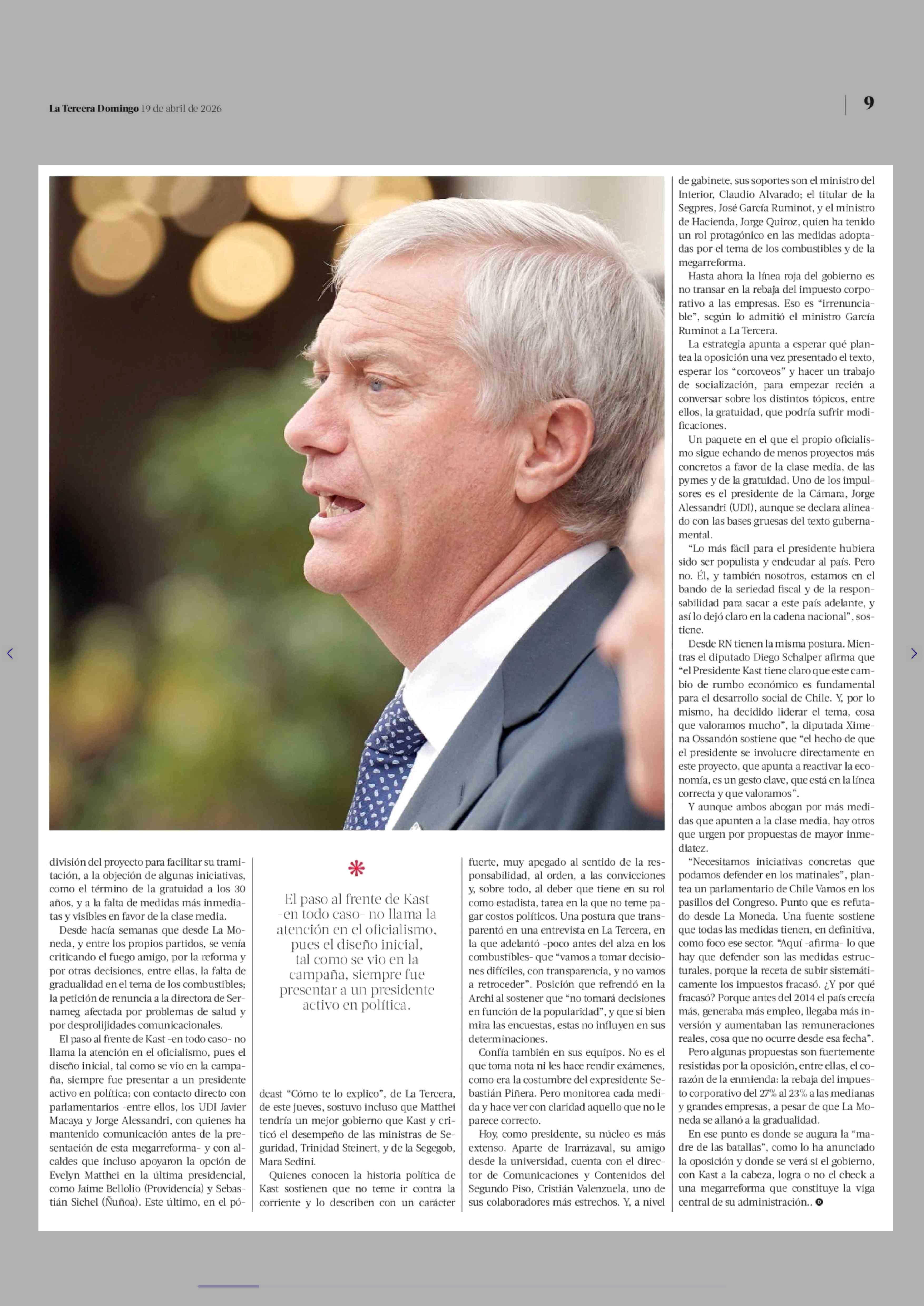 Kast toma el control de su principal apuesta política 19-04-2026 La Tercera |
