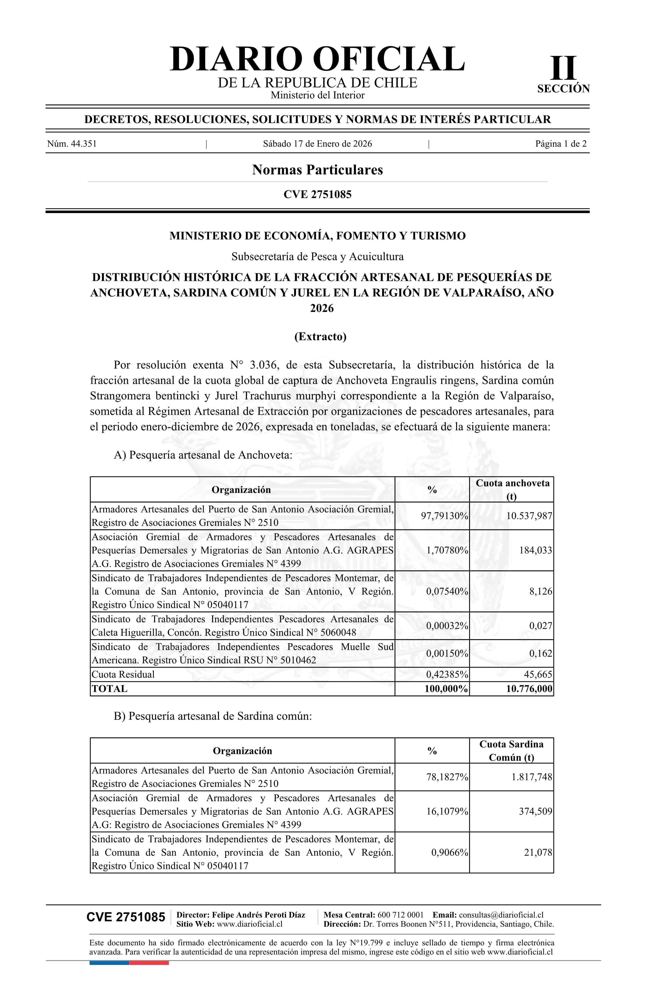 Extracto de resolución exenta número 3.036, de 2025.- Distribuye fracción artesanal de pesquerías de Anchoveta, Sardina común y Jurel en la Región de Valparaíso, año 2026