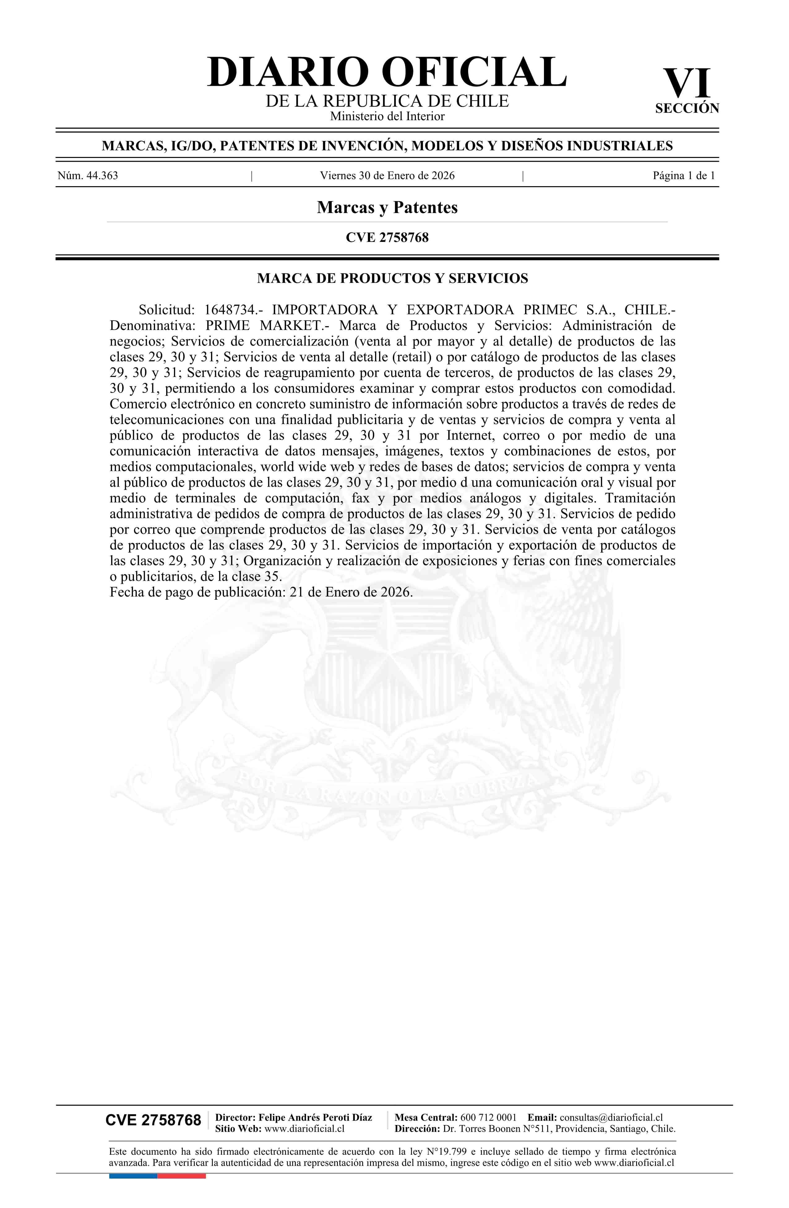 Solicitud número 1648734.- PRIME MARKET 30-01-2026 Diario Oficial Edición Electrónica |
