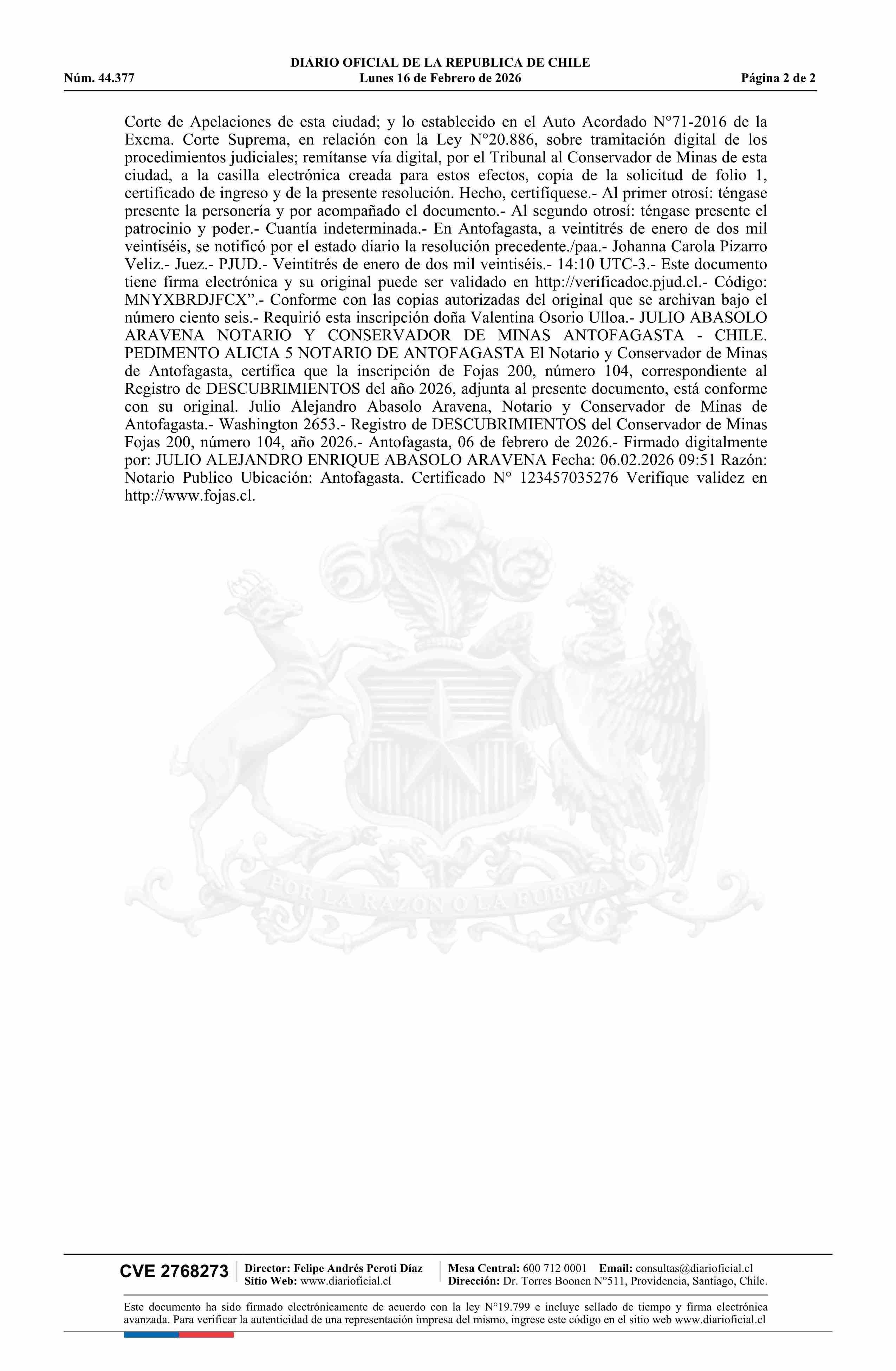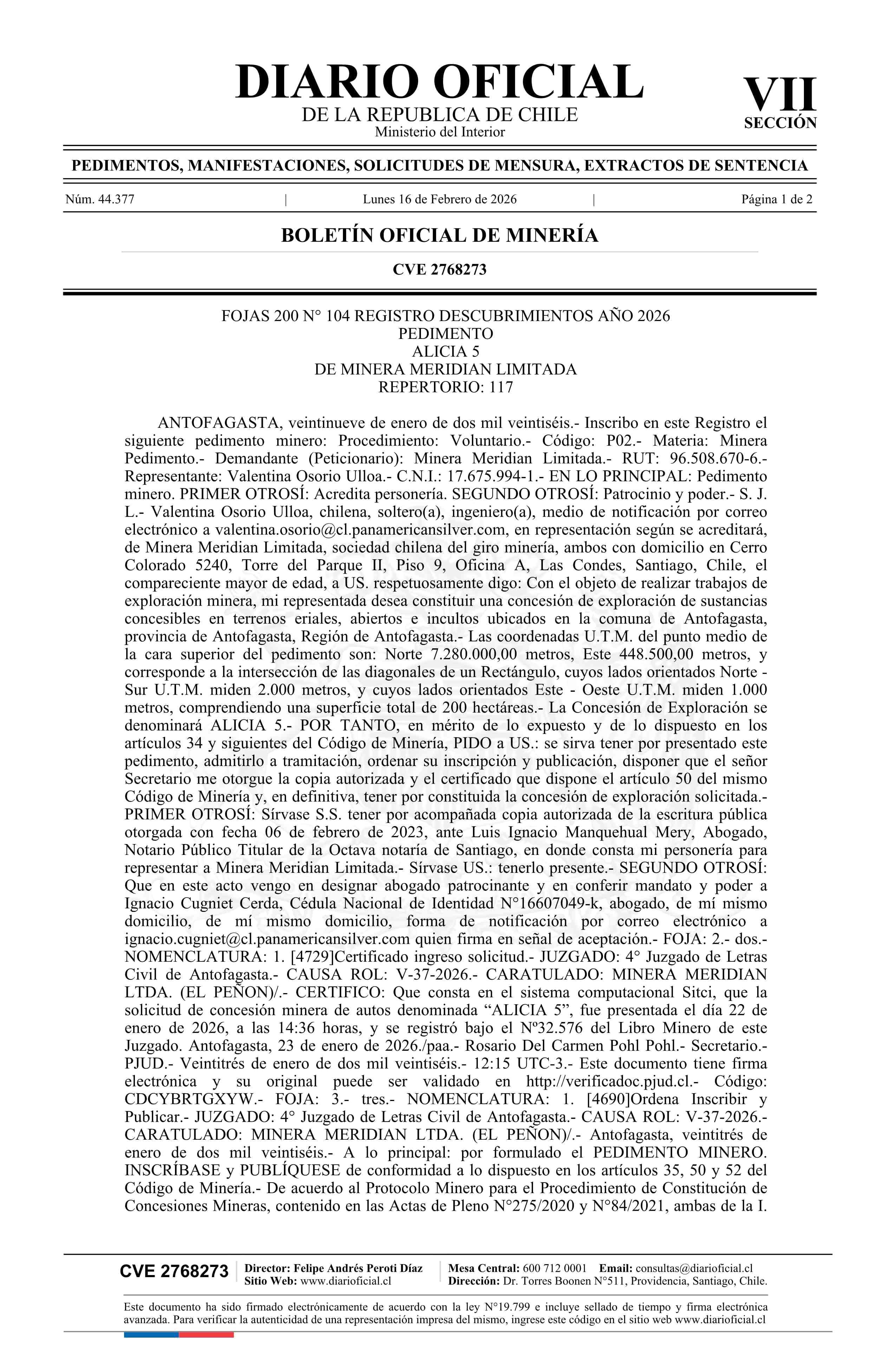 ALICIA 5 / Minera Meridian Limitada 16-02-2026 DIARIO OFICIAL CHILE - BOLETÍN OFICIAL DE MINERÍA |