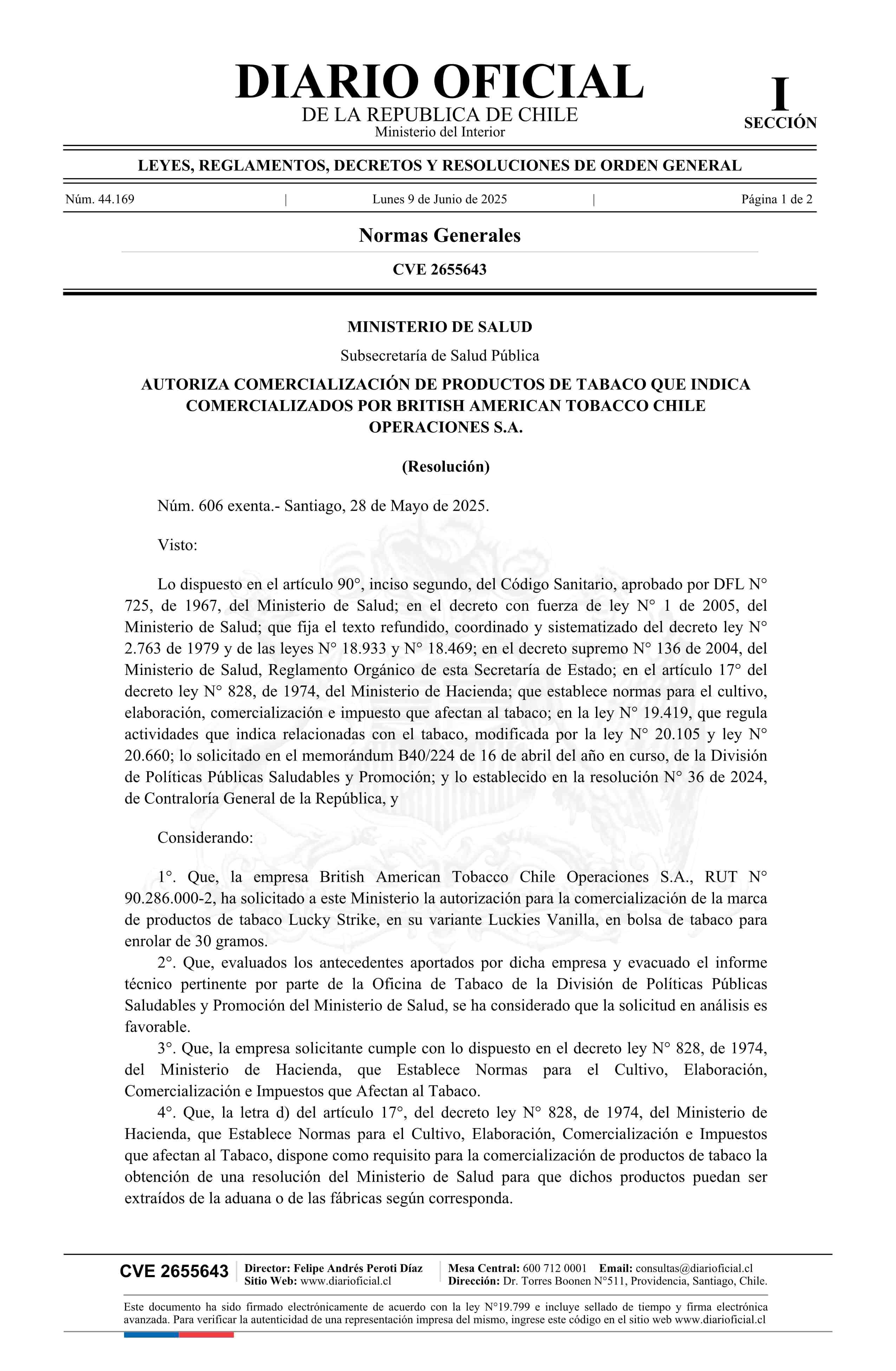 Resolución exenta número 606, de 2025.- Autoriza comercialización de productos de tabaco que indica comercializados por British American Tobacco Chile Operaciones S.A. 09-06-2025 DIARIO OFICIAL CHILE - BOLETÍN OFICIAL DE MINERÍA |