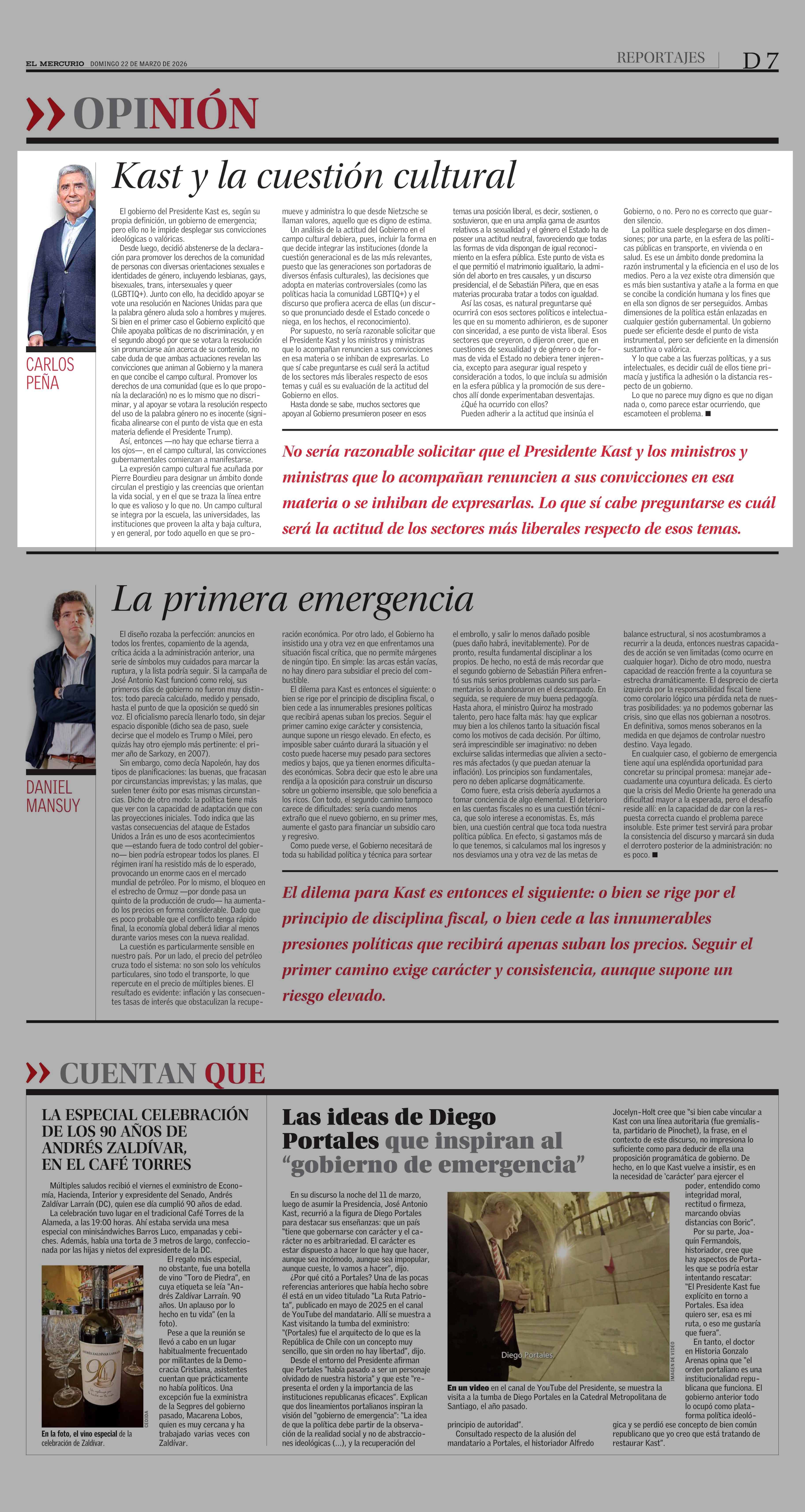 Columnas de Opinión: Kast y la cuestión cultural 22-03-2026 El Mercurio |
