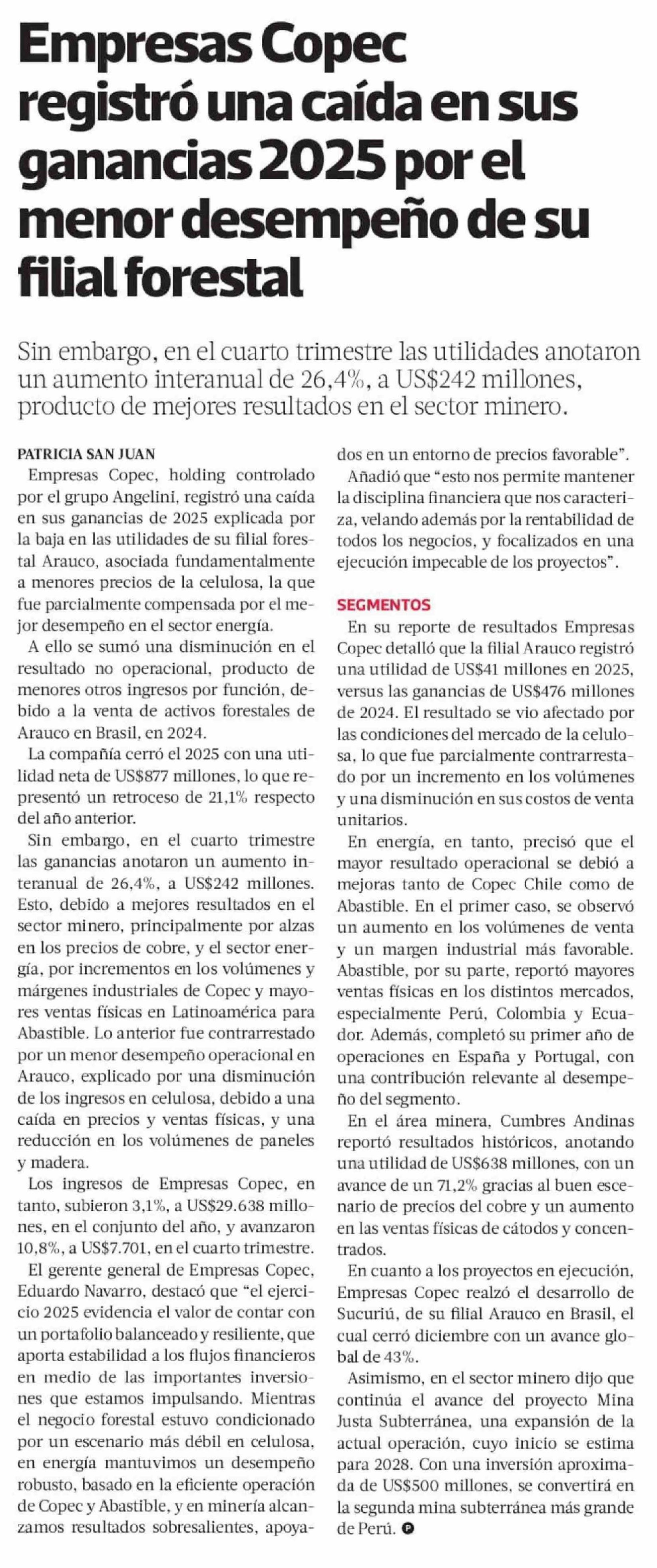 Título: Empresas Copec registró una caída en sus ganancias 2025 por el menor desempeño de su filial forestal