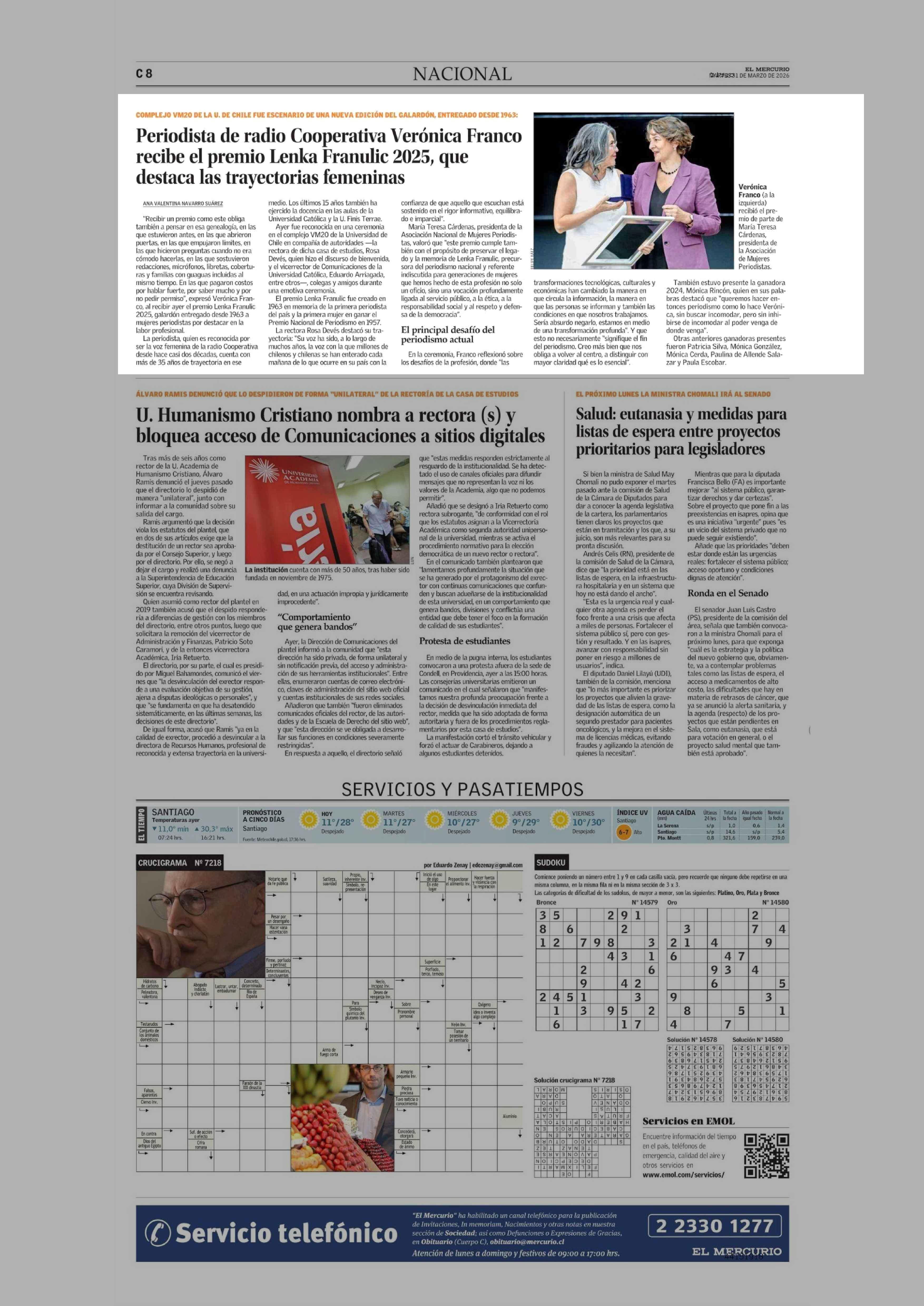 Periodista de radio Cooperativa Verónica Franco recibe el premio Lenka Franulic 2025, que destaca las trayectorias femeninas 31-03-2026 El Mercurio |