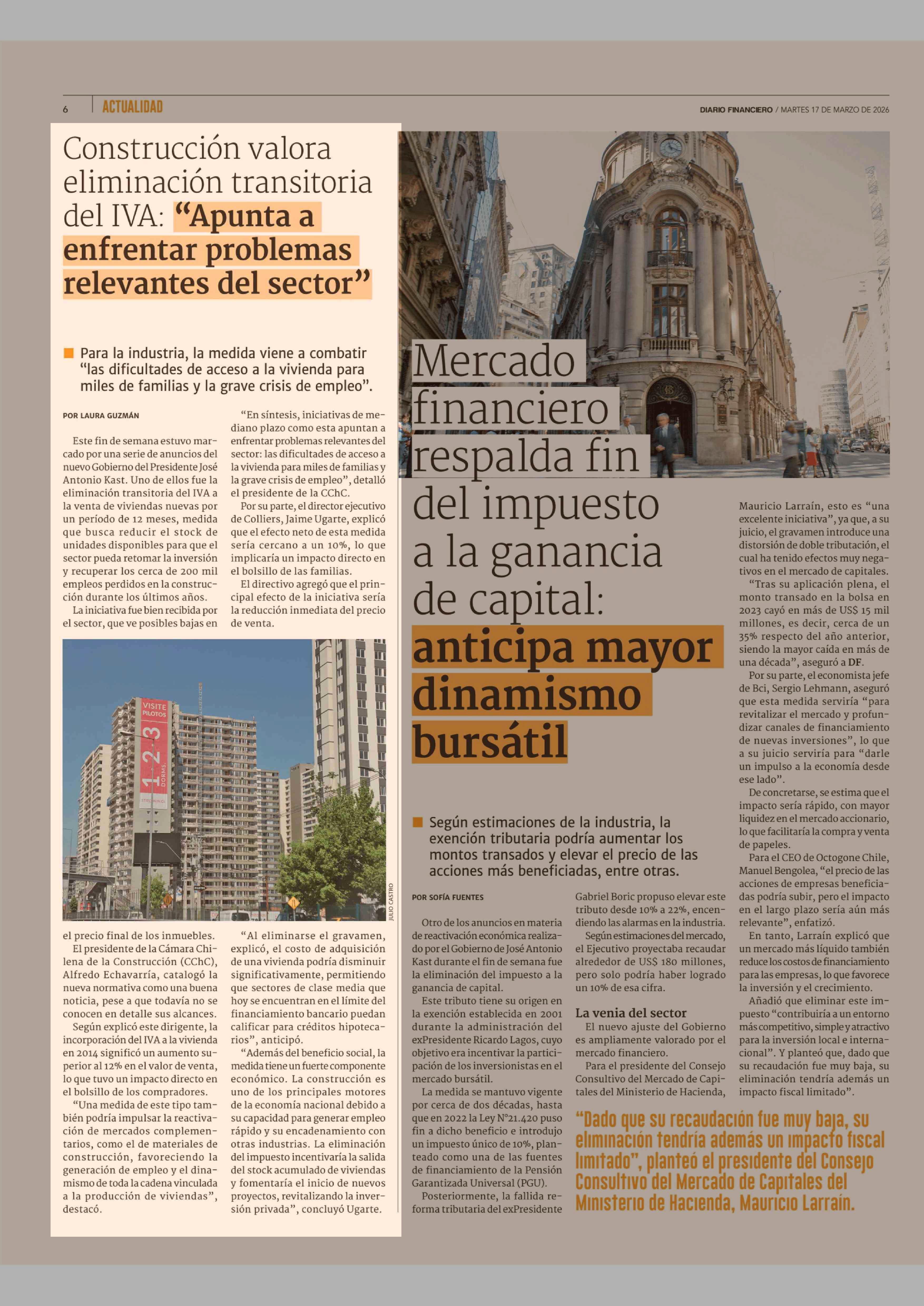 Construcción valora eliminación transitoria del IVA: "Apunta a enfrentar problemas relevantes del sector" 17-03-2026 Diario Financiero |
