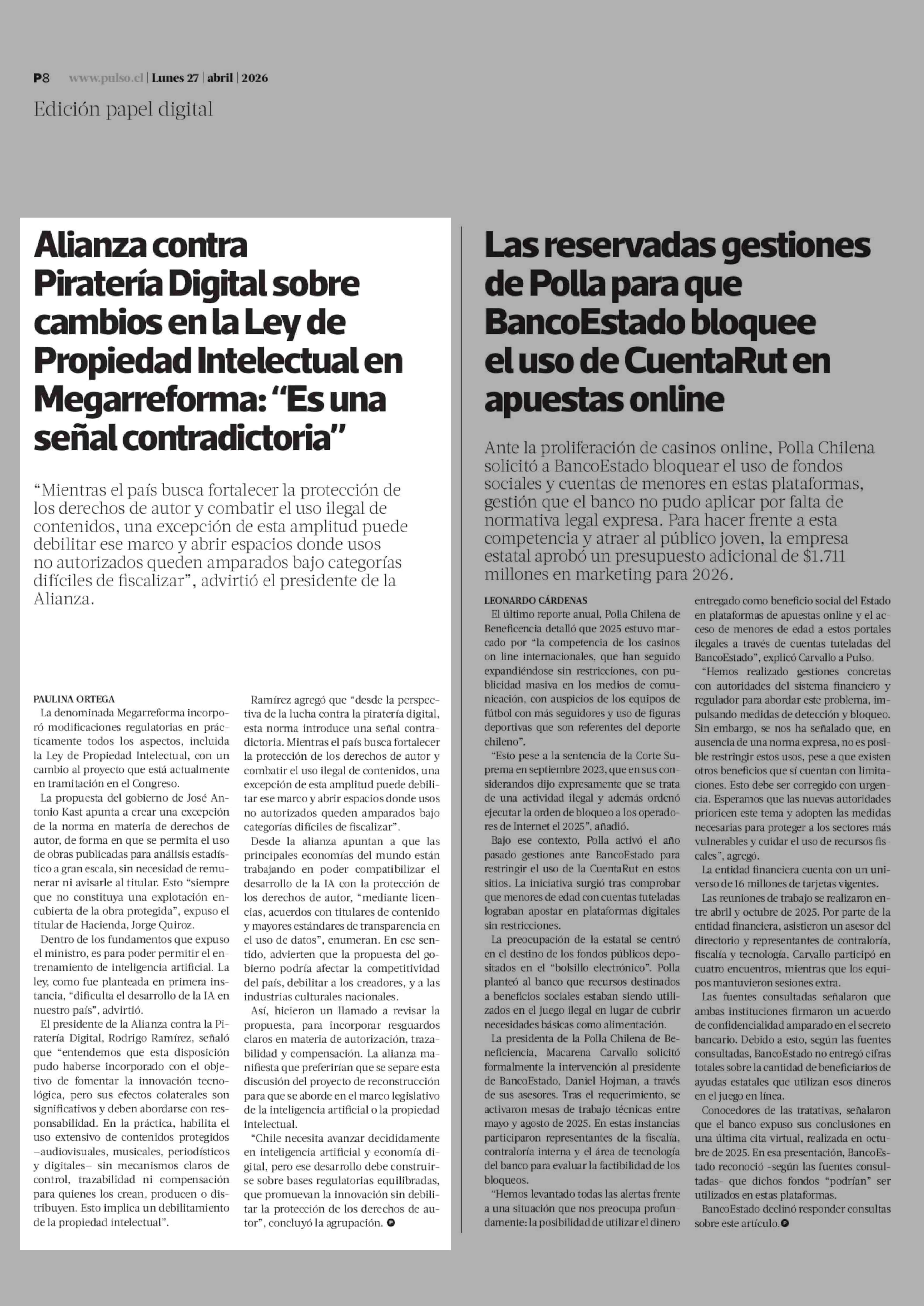 Alianza contra Piratería Digital sobre cambios en la Ley de Propiedad Intelectual en Megarreforma: "Es una señal contradictoria" 27-04-2026 La Tercera |