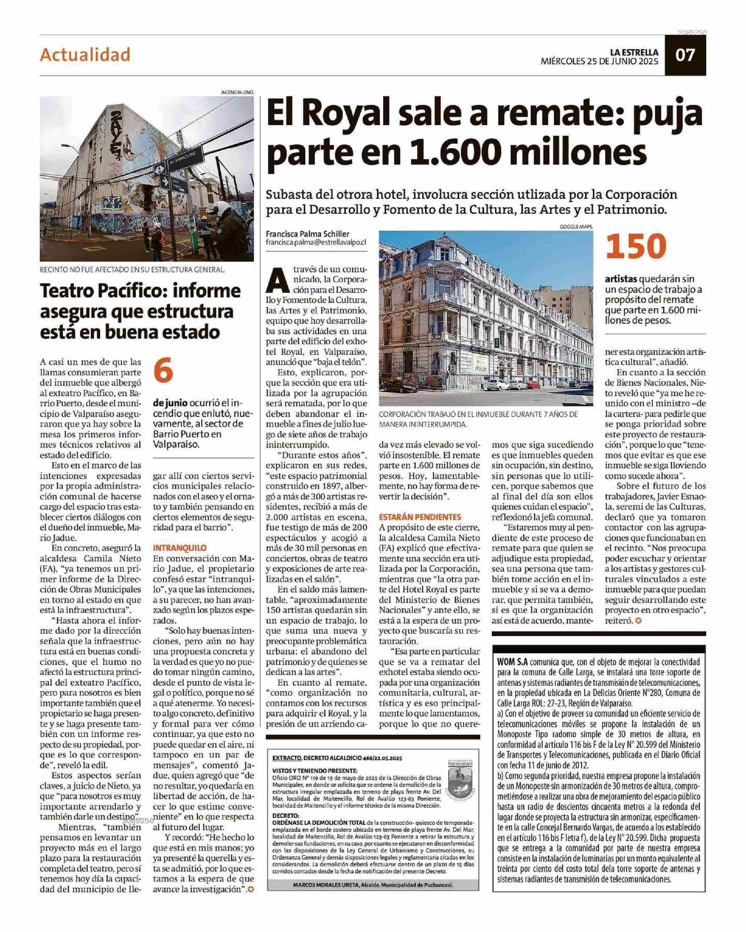El Royal sale a remate: puja parte en 1.600 millones 25-06-2025 La Estrella de Valparaíso |