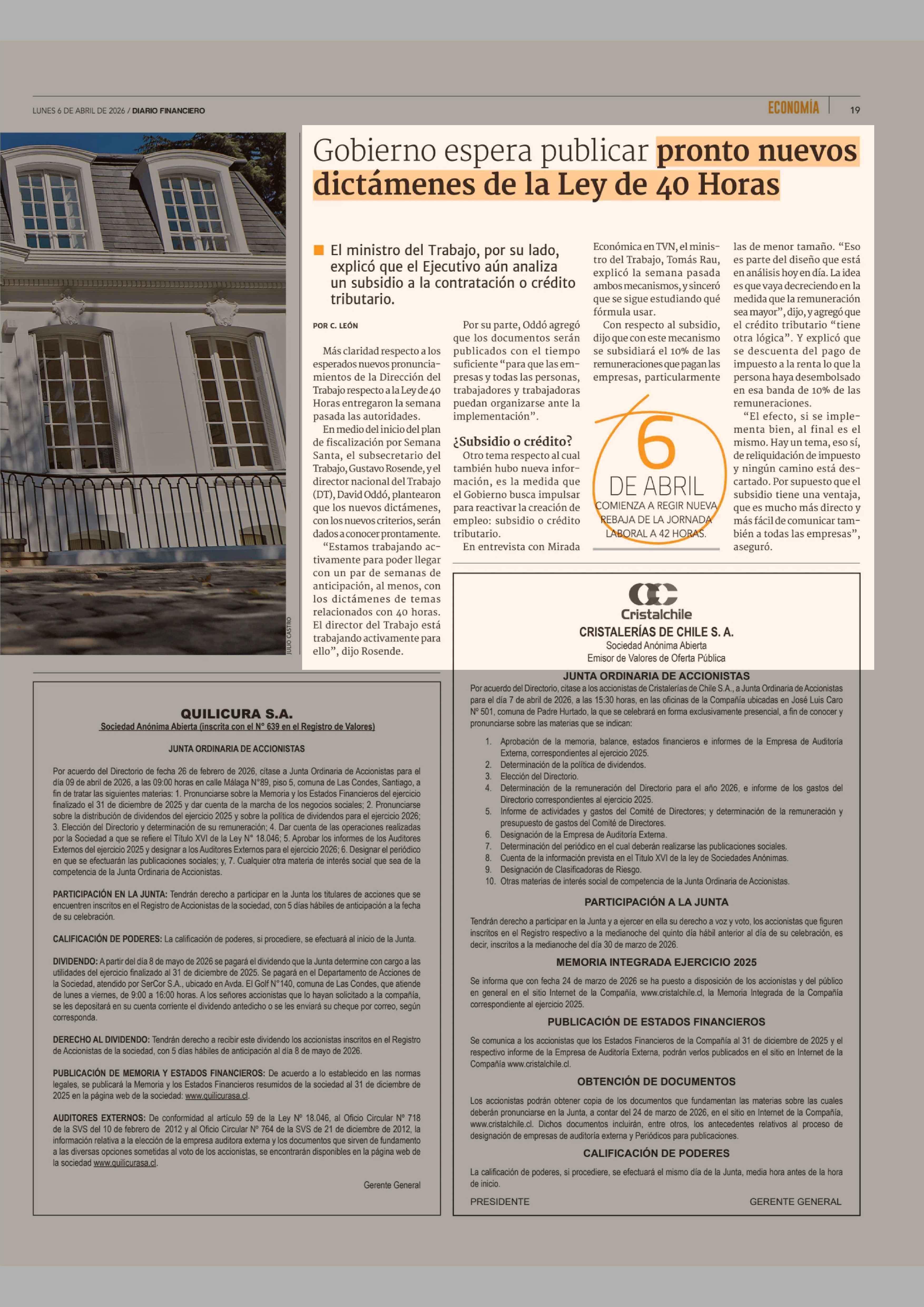 Gobierno espera publicar pronto nuevos dictámenes de la Ley de 40 Horas 06-04-2026 Diario Financiero |