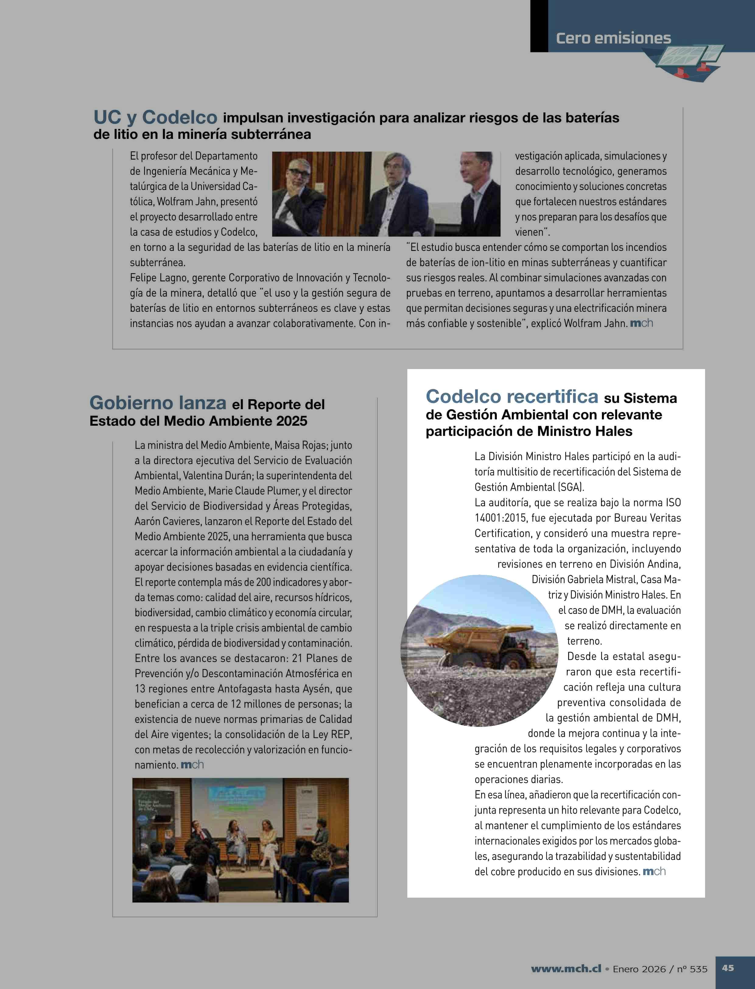 Codelco recertifica su Sistema de Gestión Ambiental con relevante participación de Ministro Hales 23-01-2026 Revista Minería Chilena |