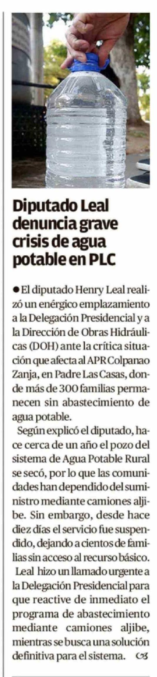 Título: Diputado Leal denuncia grave crisis de agua potable en PLC