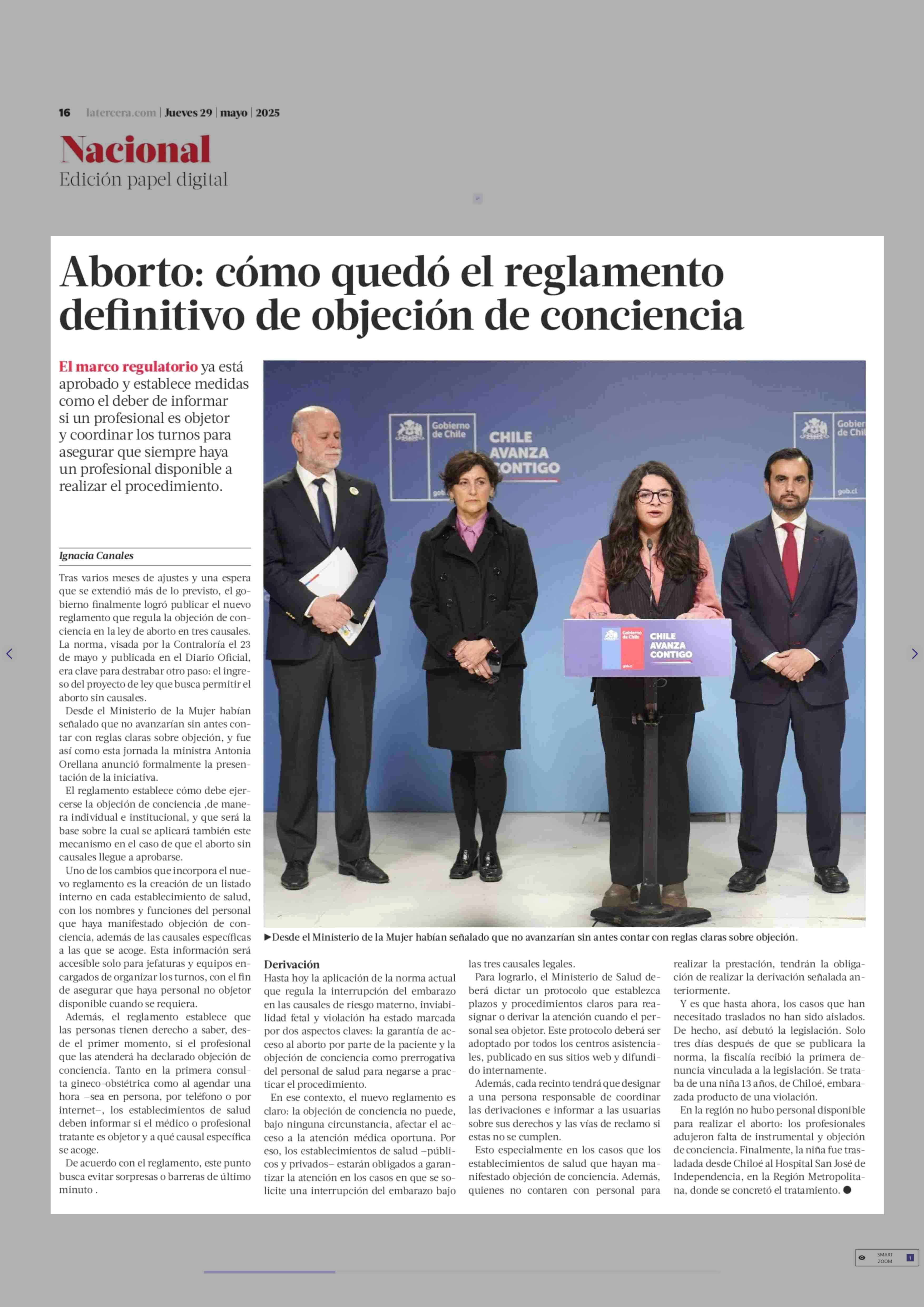 Aborto: cómo quedó el reglamento definitivo de objeción de conciencia 29-05-2025 La Tercera |