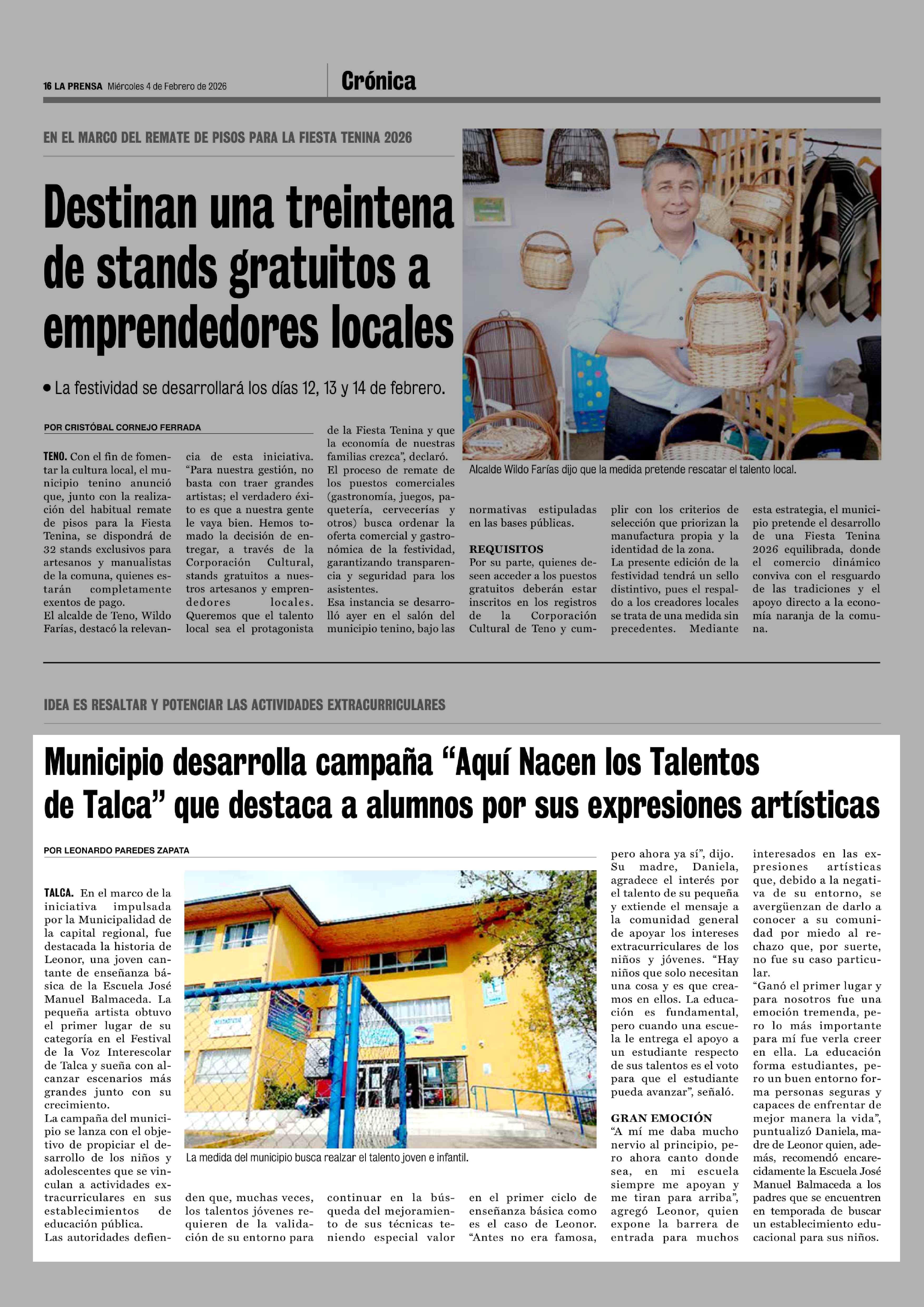 Municipio desarrolla campaña "Aquí Nacen los Talentos de Talca" que destaca a alumnos por sus expresiones artísticas 04-02-2026 La Prensa de Curicó |