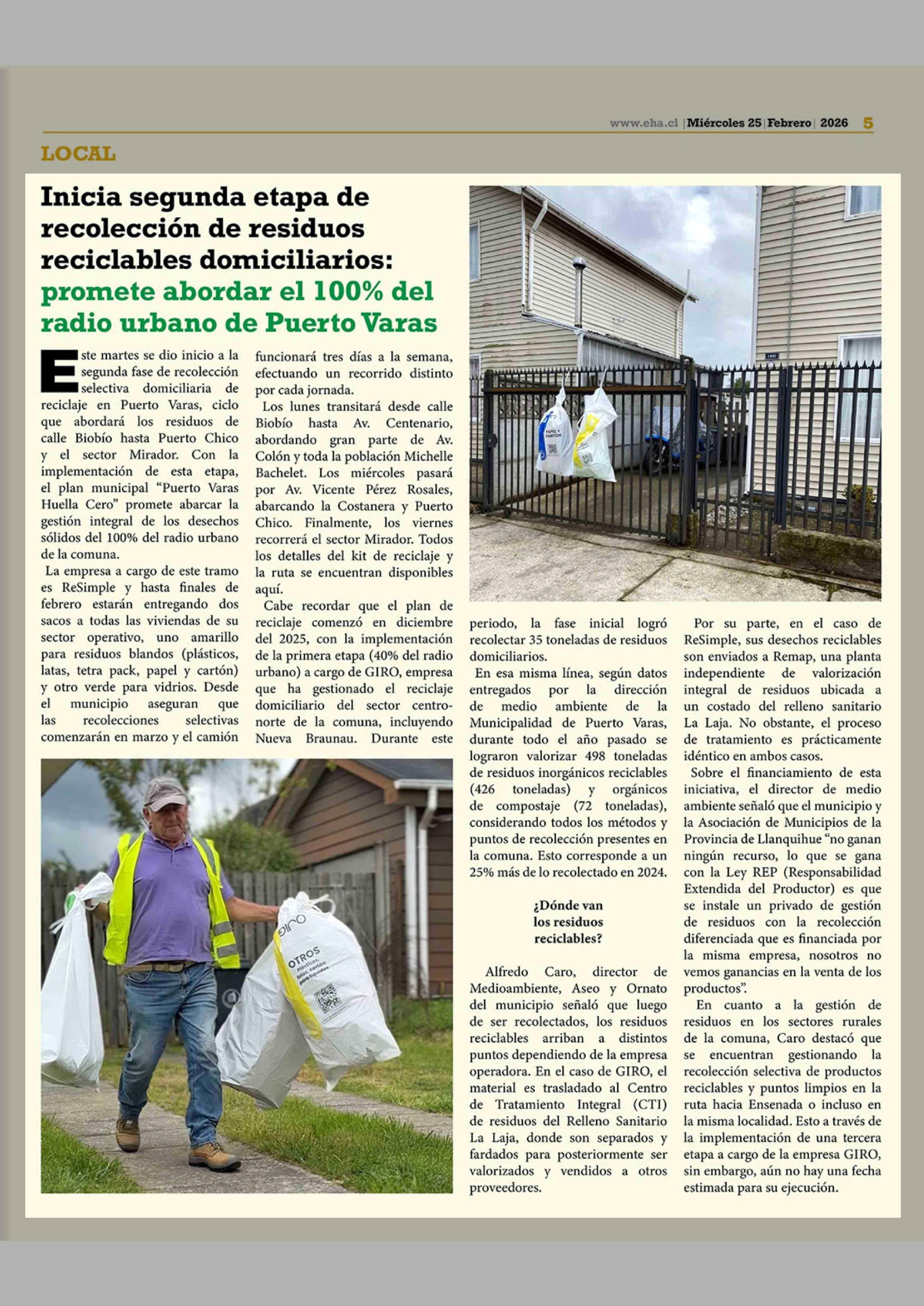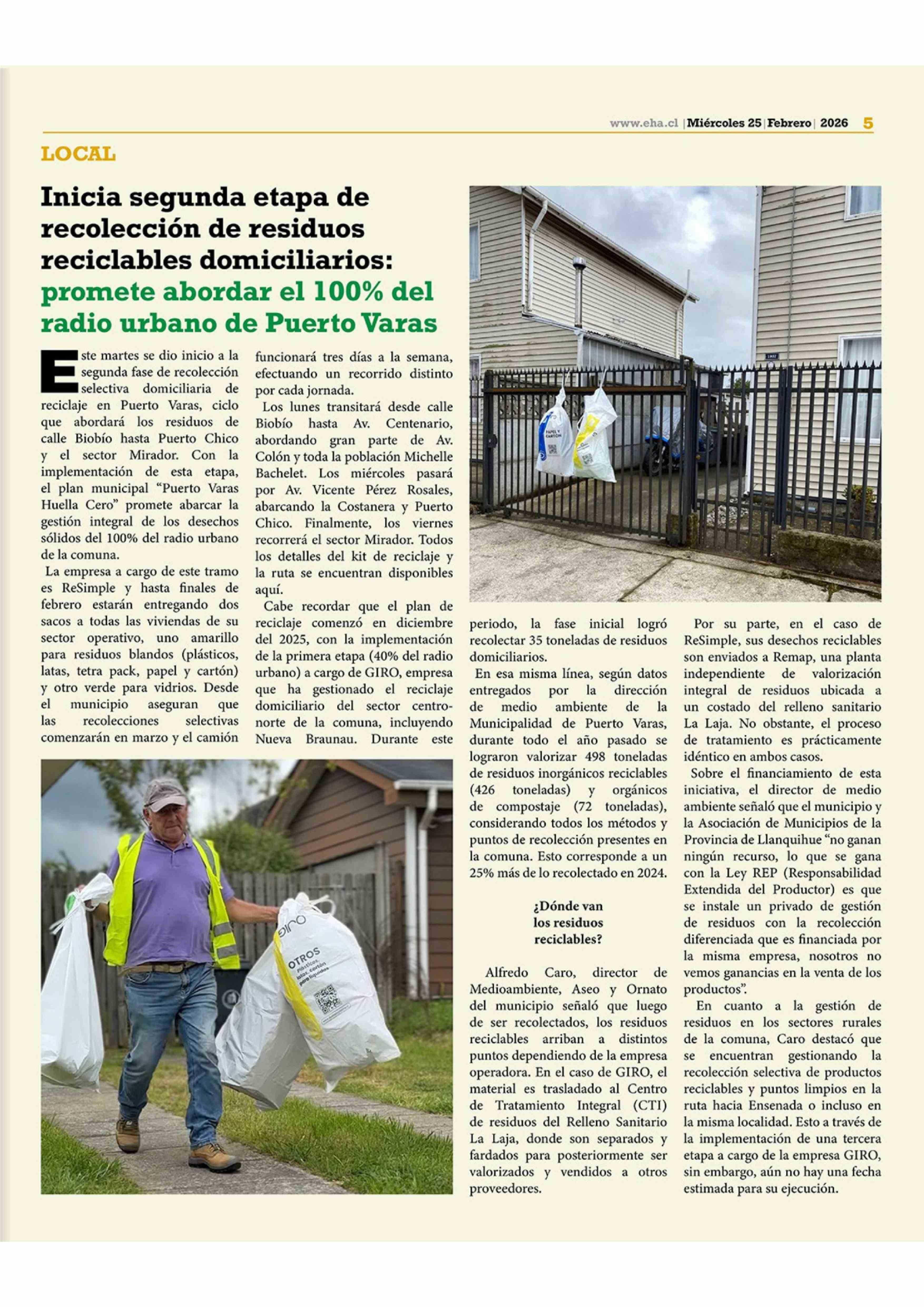 Título: Inicia segunda etapa de recolección de residuos reciclables domiciliarios: promete abordar el 100% del radio urbano de Puerto Varas