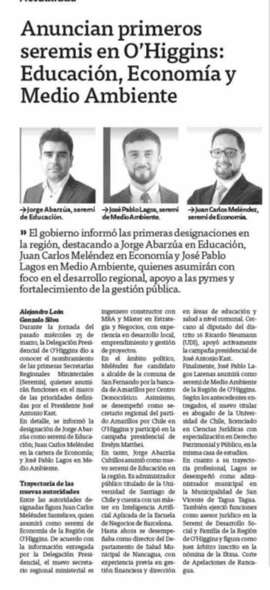 Anuncian primeros seremis en O'Higgins: Educación, Economía y Medio Ambiente 26-03-2026 El Tipógrafo |