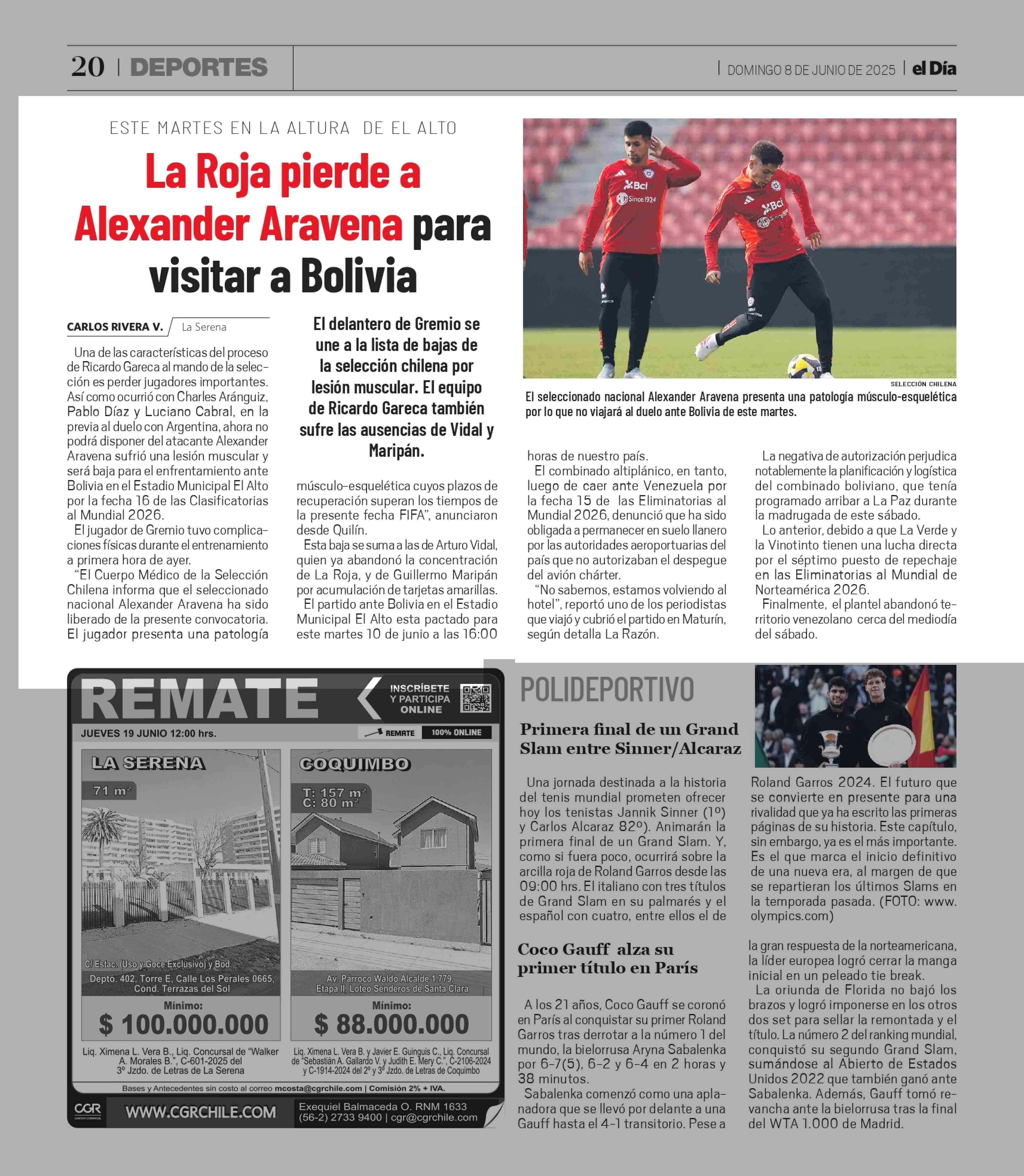 La Roja pierde a Alexander Aravena para visitar a Bolivia 08-06-2025 El Día |