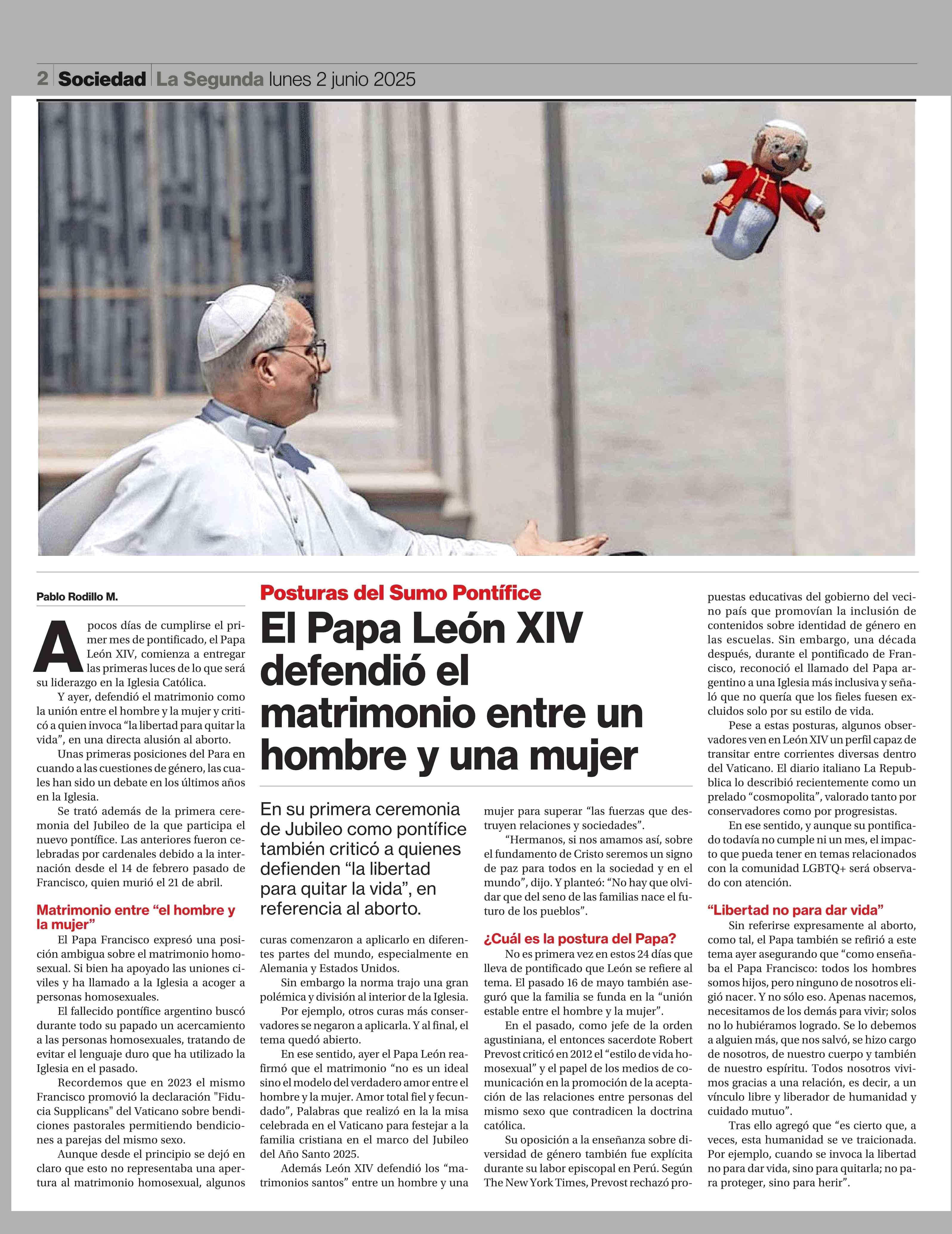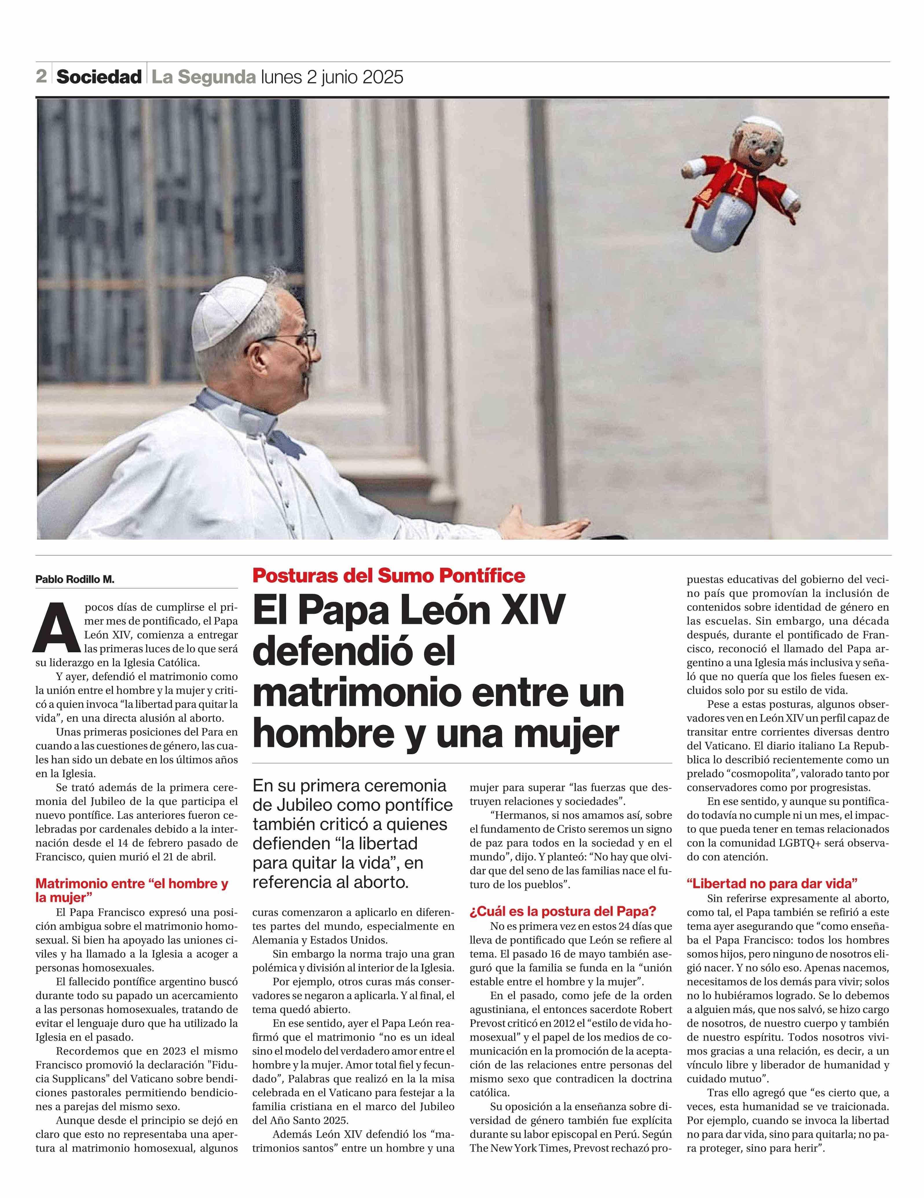 El Papa León XIV defendió el matrimonio entre un hombre y una mujer 02-06-2025 La Segunda |