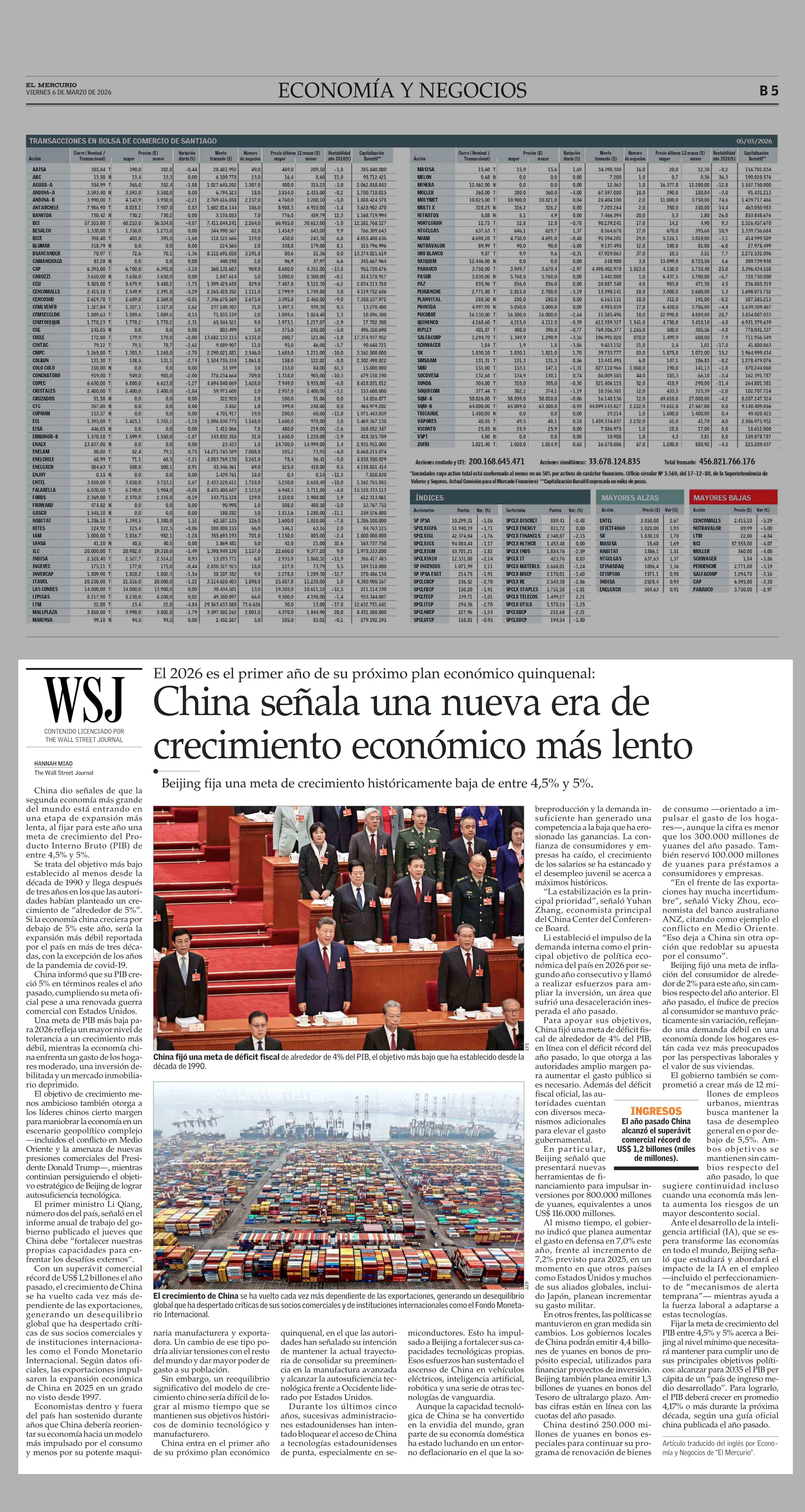China señala una nueva era de crecimiento económico más lento 06-03-2026 El Mercurio |