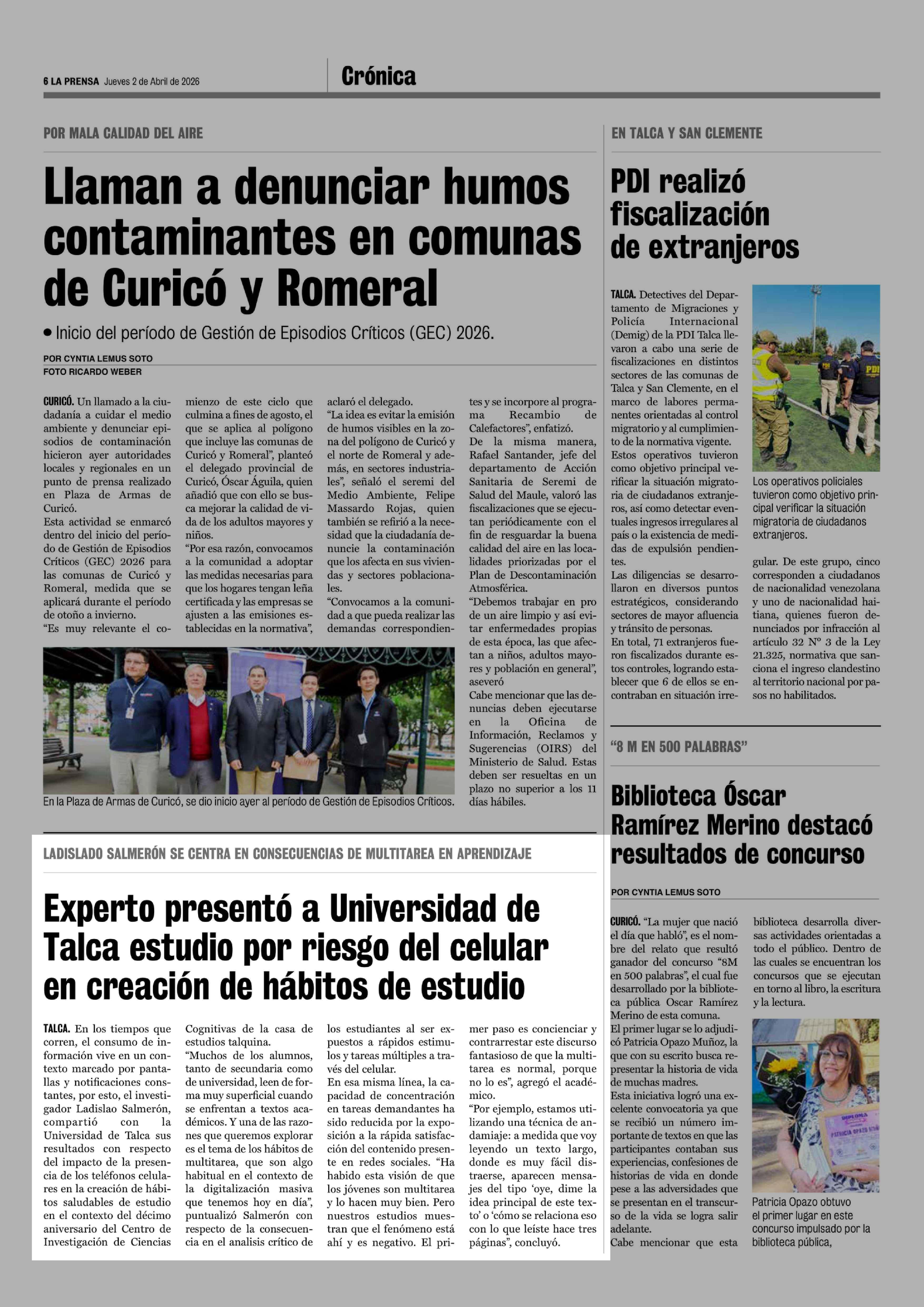 Experto presentó a Universidad de Talca estudio por riesgo del celular en creación de hábitos de estudio 02-04-2026 La Prensa de Curicó |