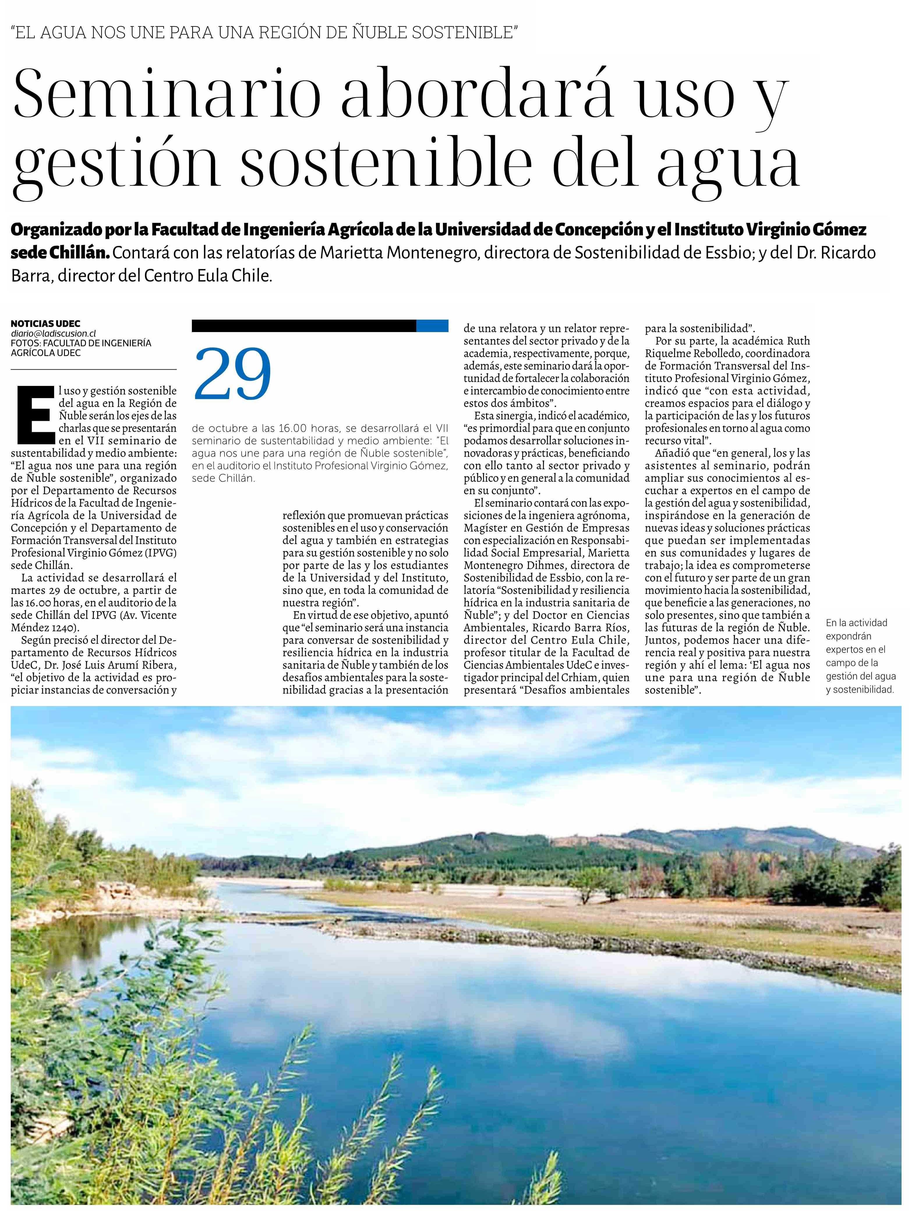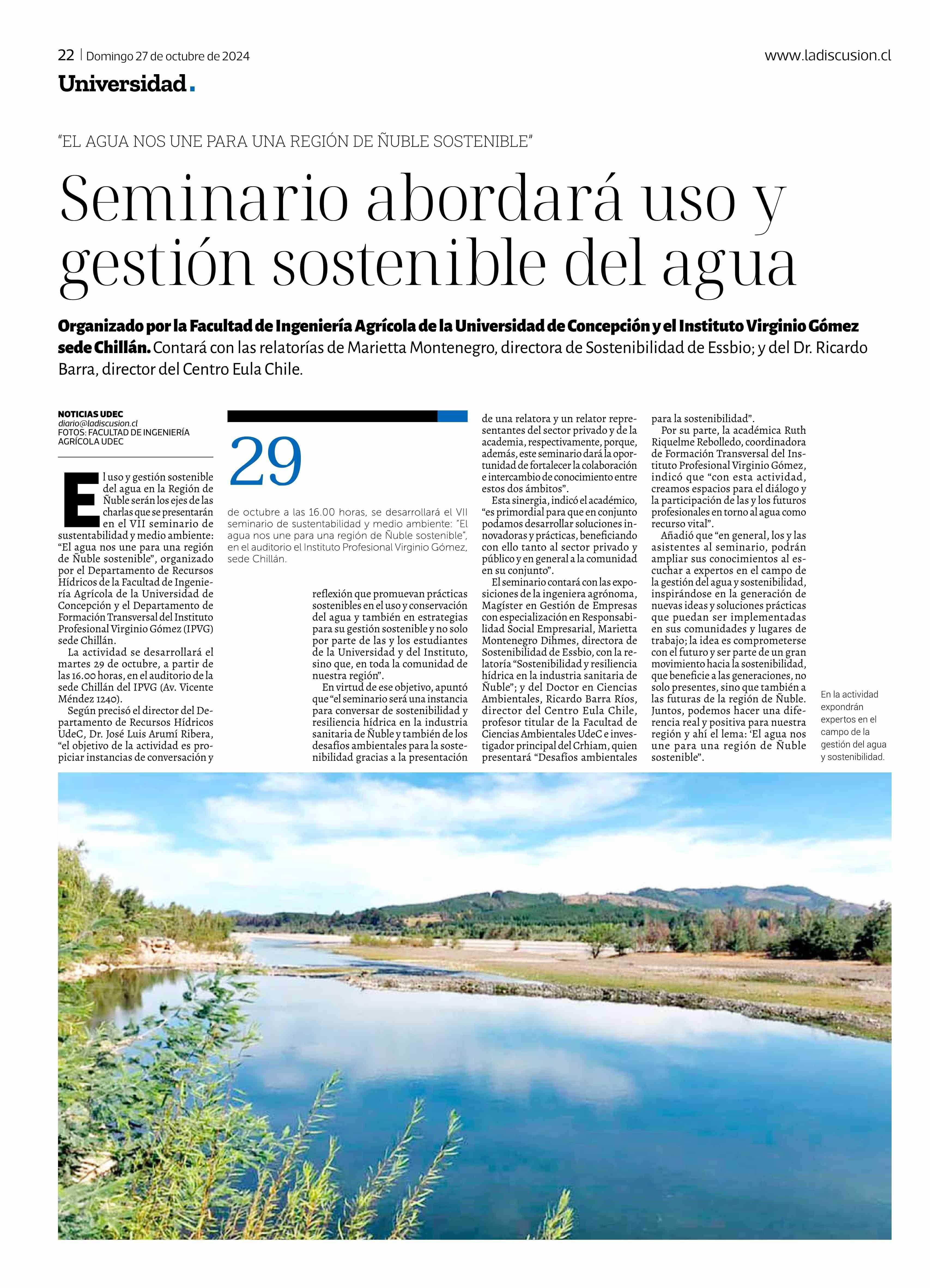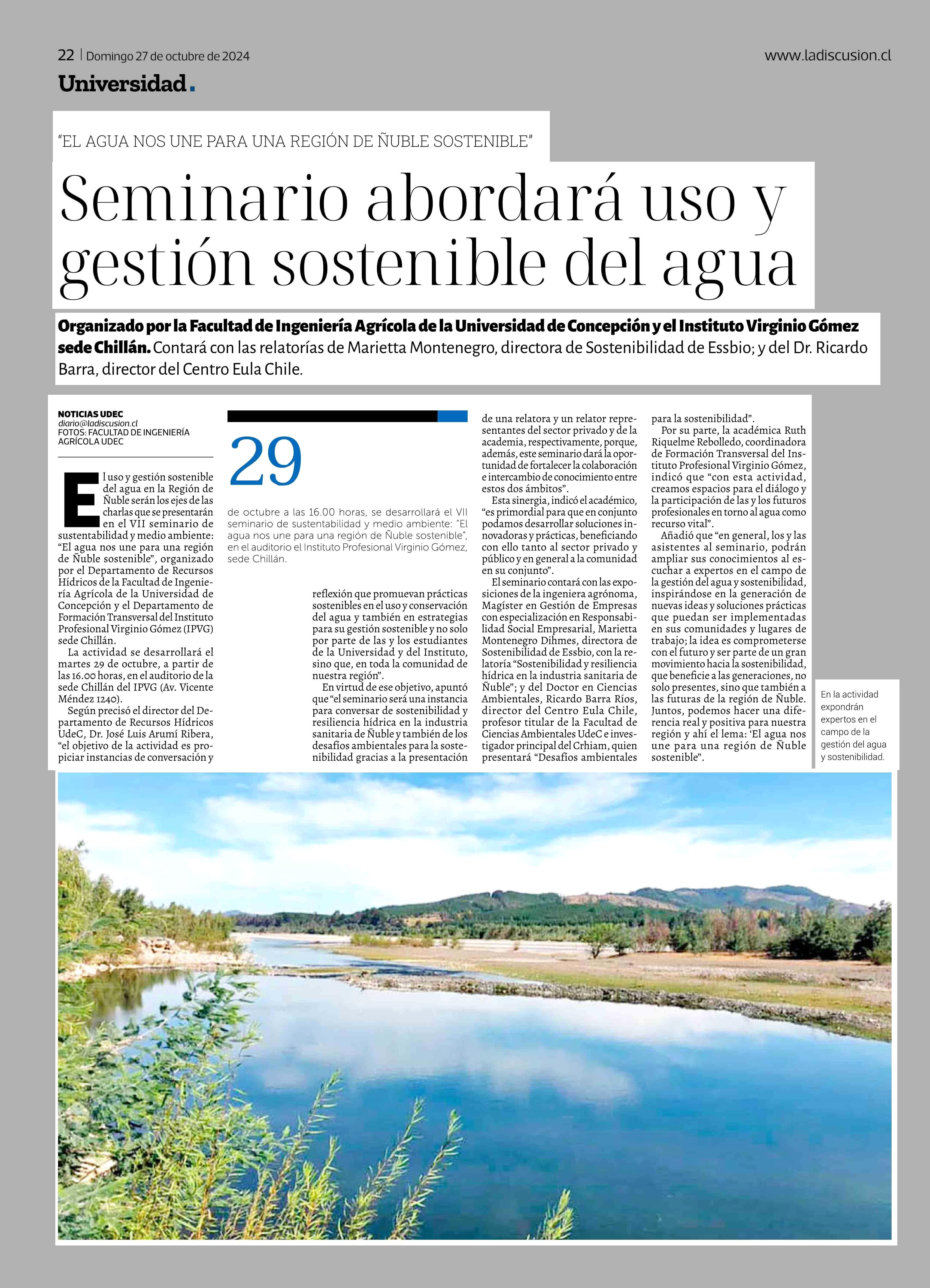 Seminario abordará uso y gestión sostenible del agua 27-10-2024 La Discusión |