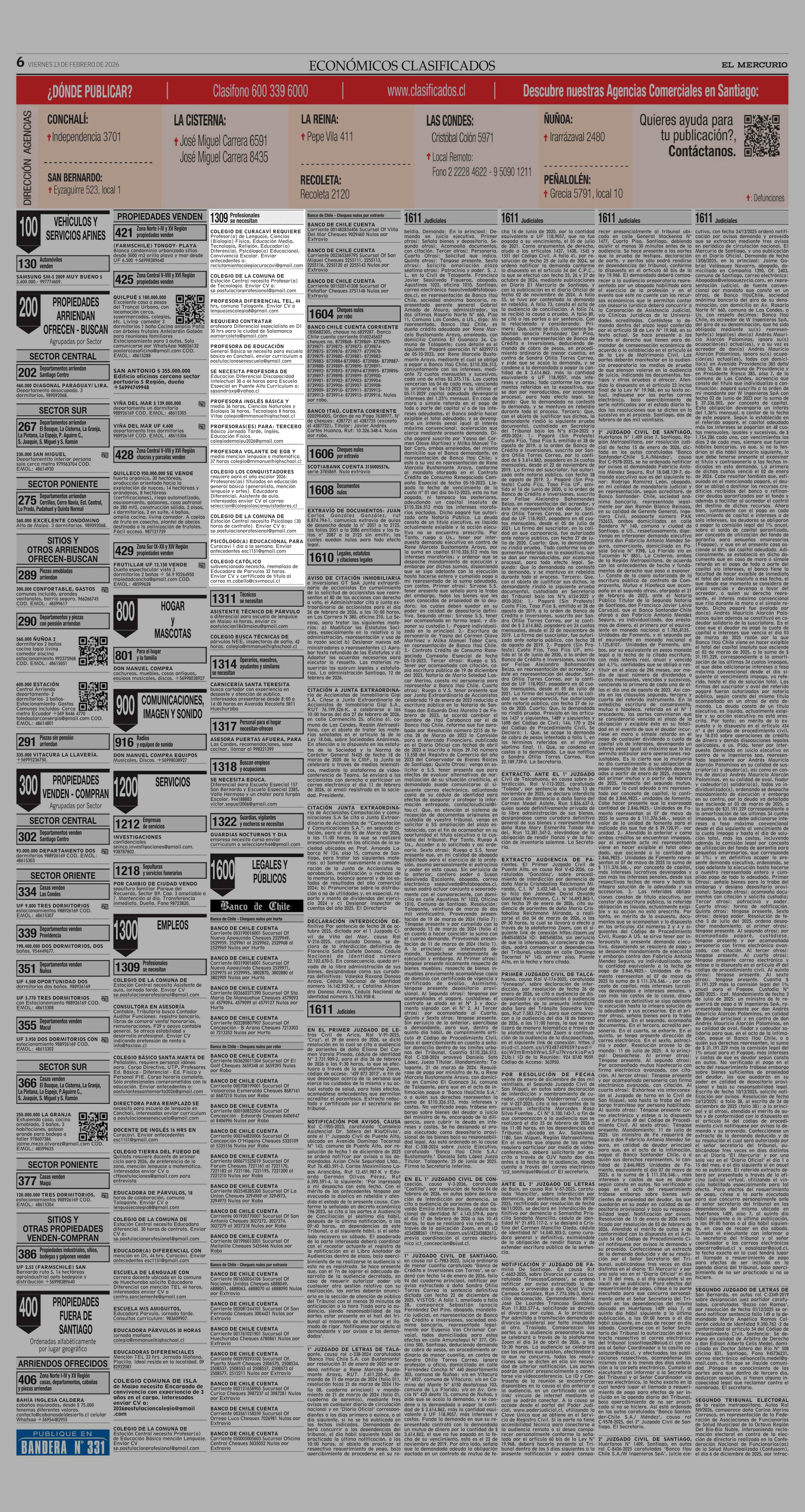 AVISO LICITACIONES: Área Educación 13-02-2026 El Mercurio |