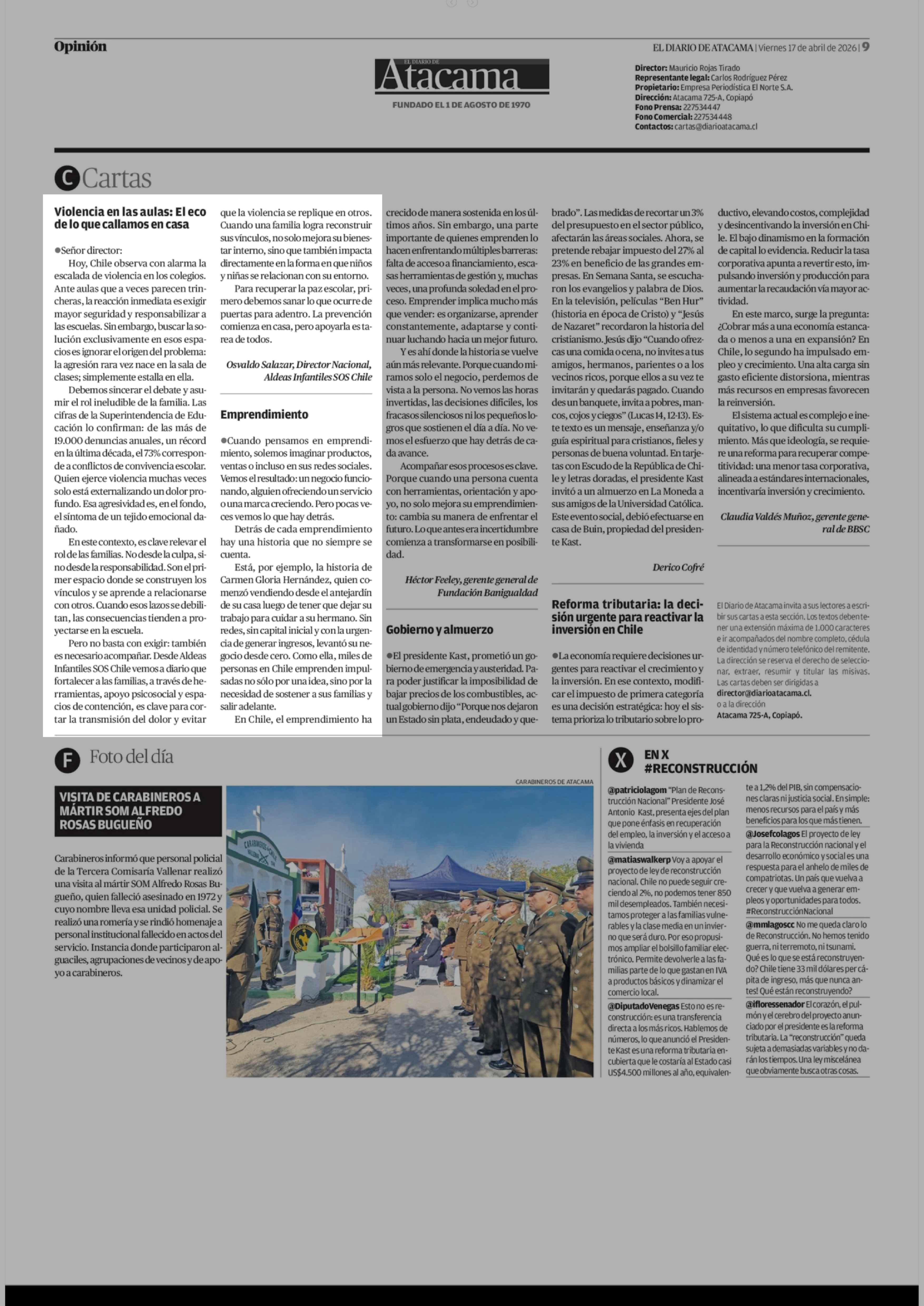 Cartas: Violencia en las aulas: El eco de lo que callamos en casa 17-04-2026 El Diario de Atacama |