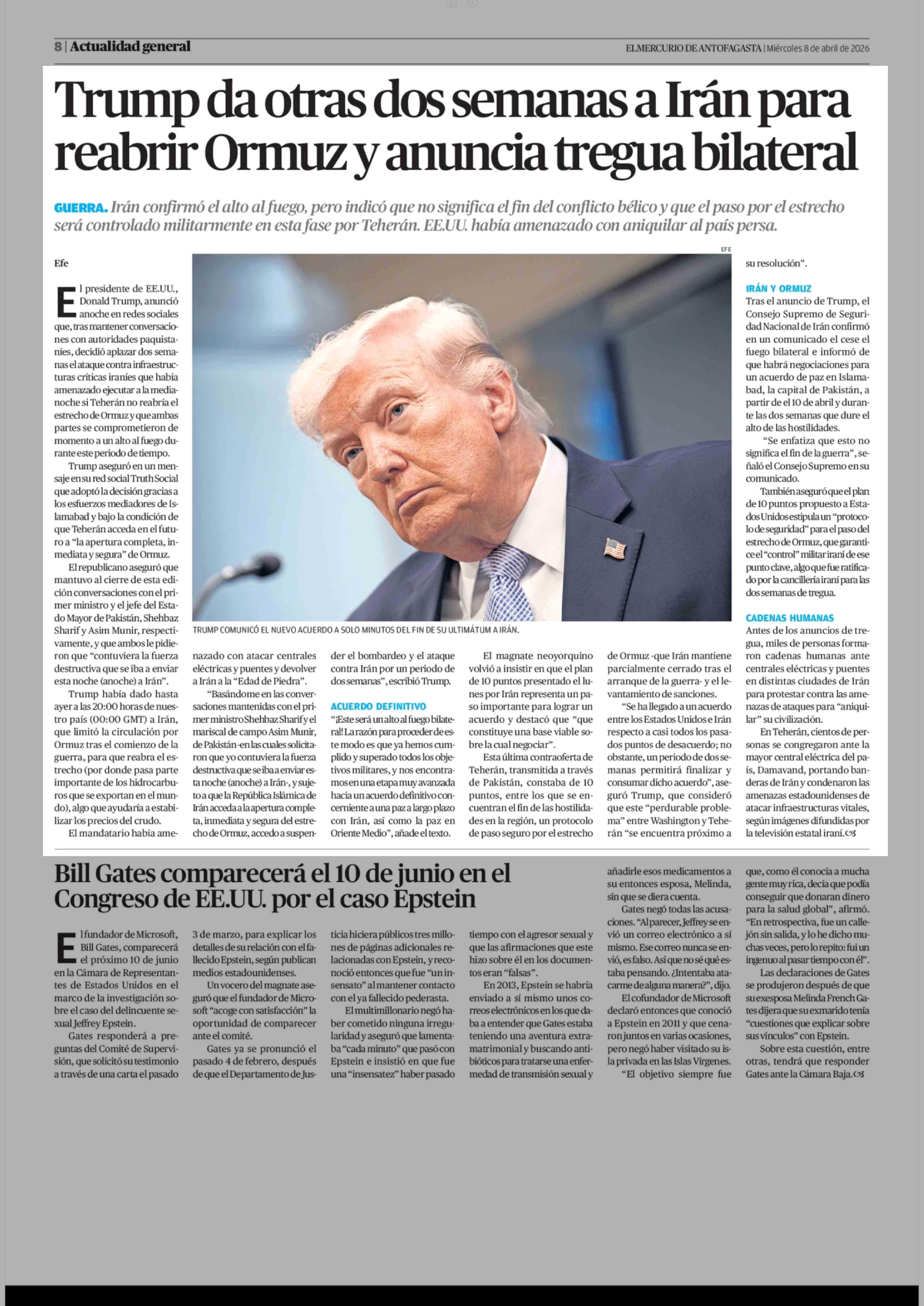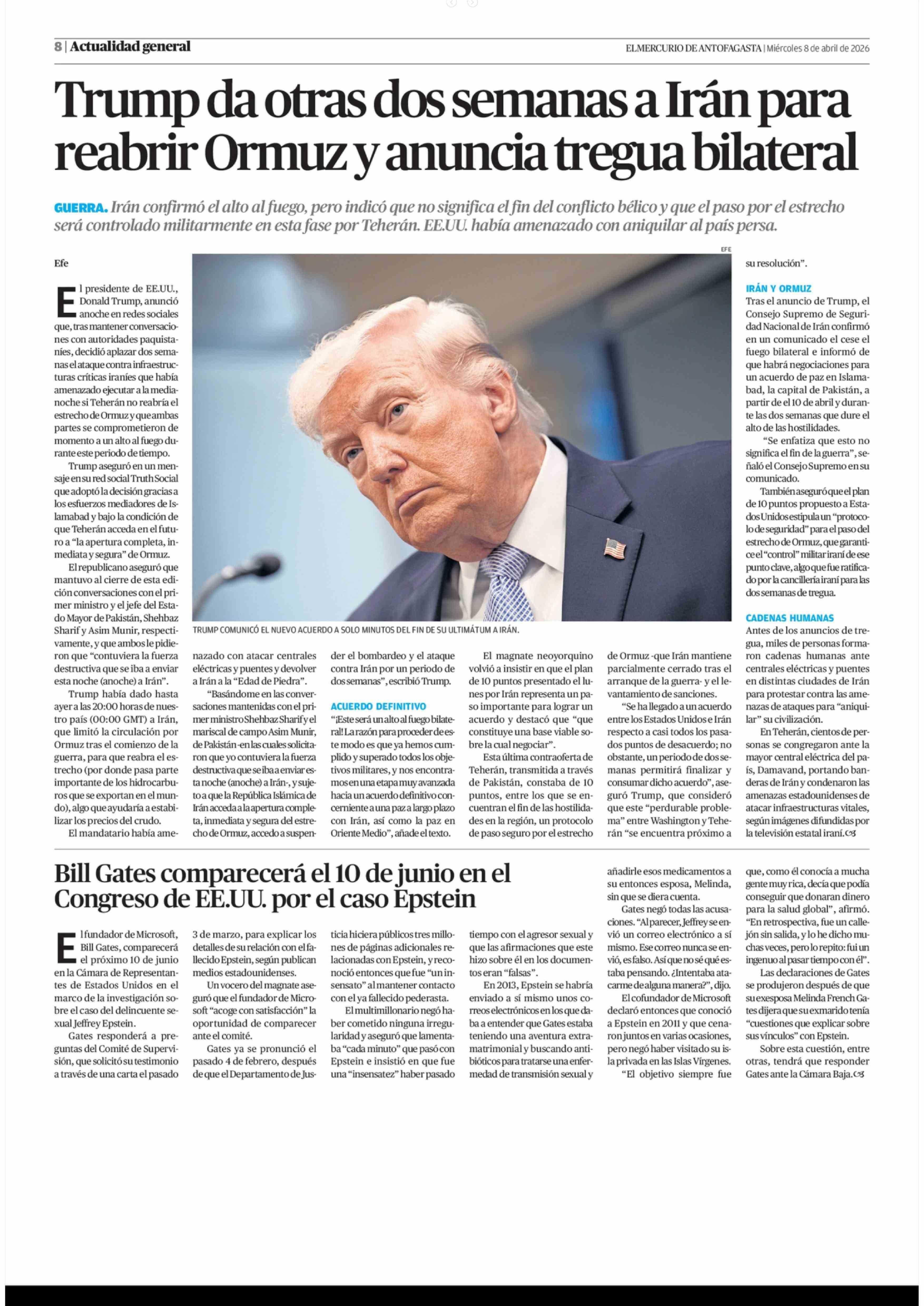 Trump da otras dos semanas a Irán para reabrir Ormuz y anuncia tregua bilateral 08-04-2026 El Mercurio de Antofagasta |