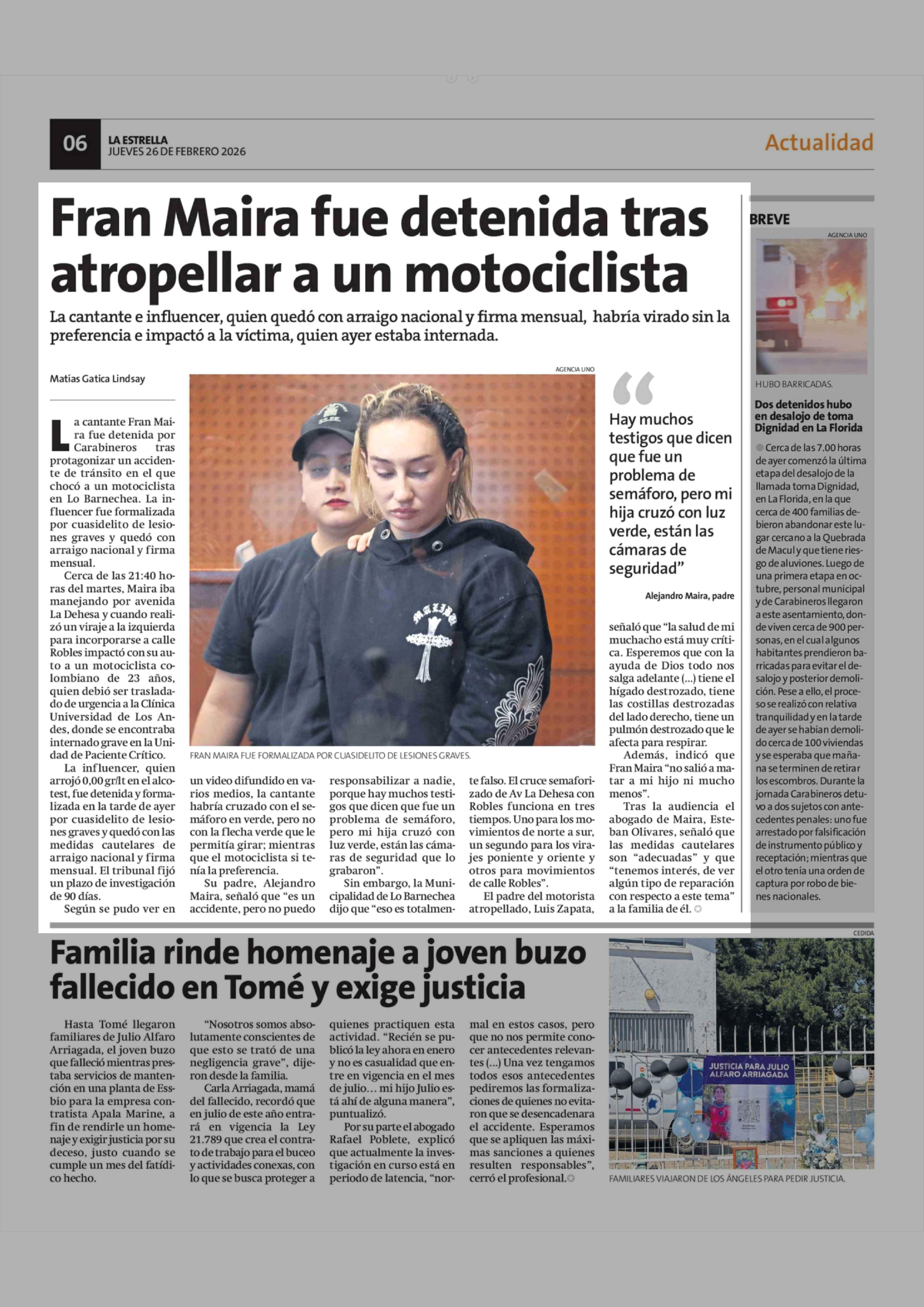 Fran Maira fue detenida tras atropellar a un motociclista 26-02-2026 La Estrella de Concepción |