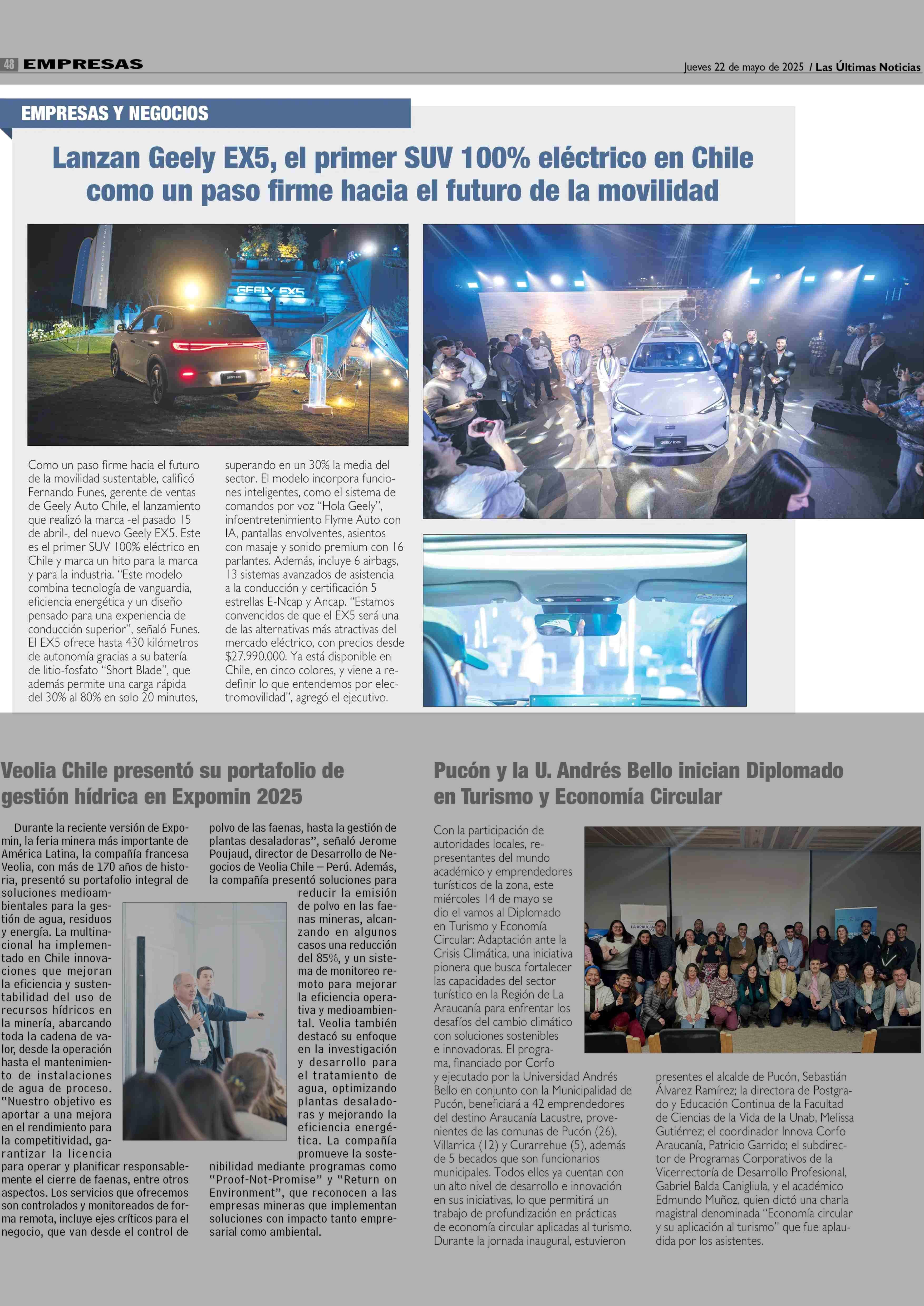 Lanzan Geely EX5, el primer SUV 100% eléctrico en Chile como un paso firme hacia el futuro de la movilidad 22-05-2025 Las Últimas Noticias |
