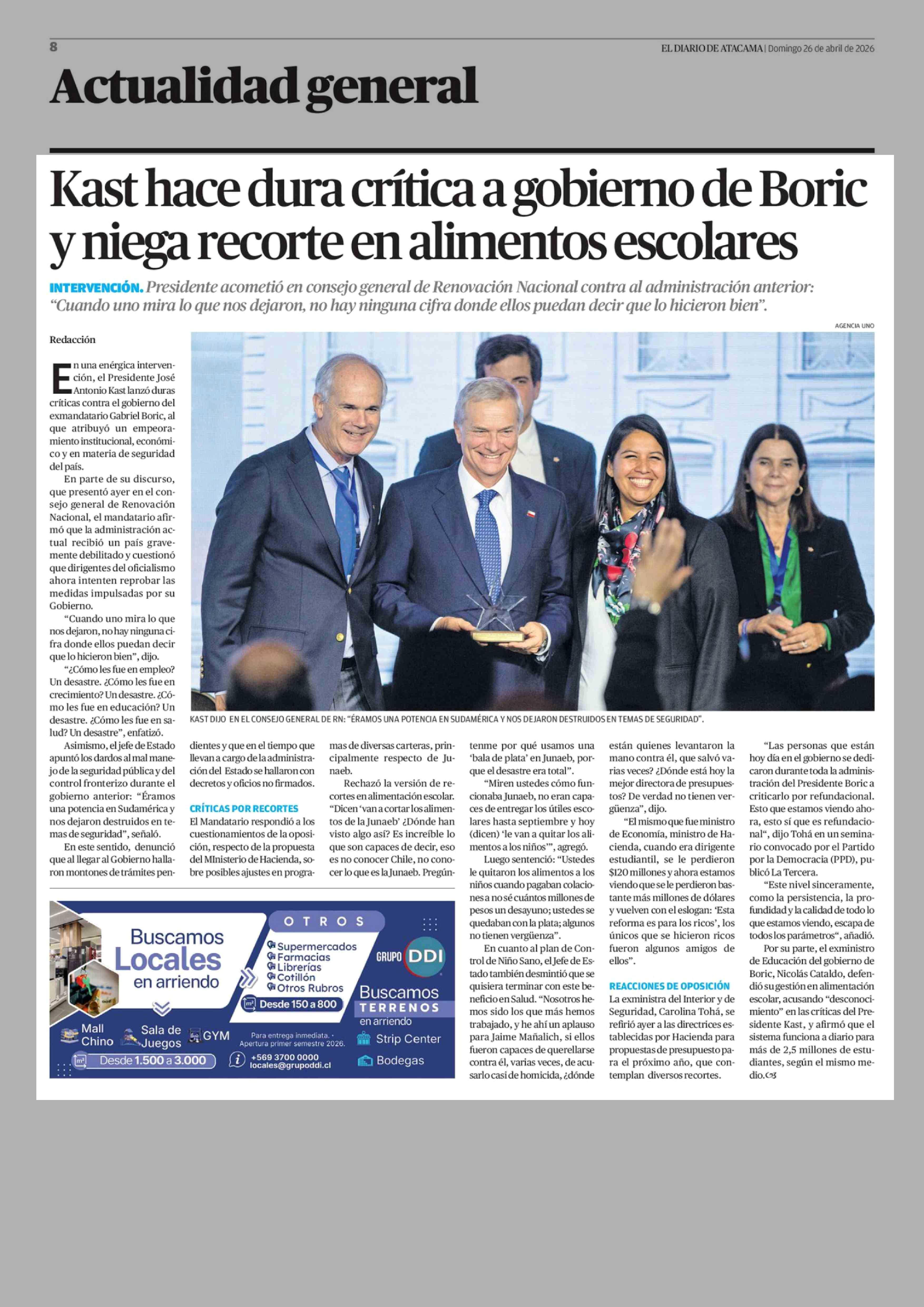 Kast hace dura crítica a gobierno de Boric y niega recorte en alimentos escolares 26-04-2026 El Diario de Atacama |