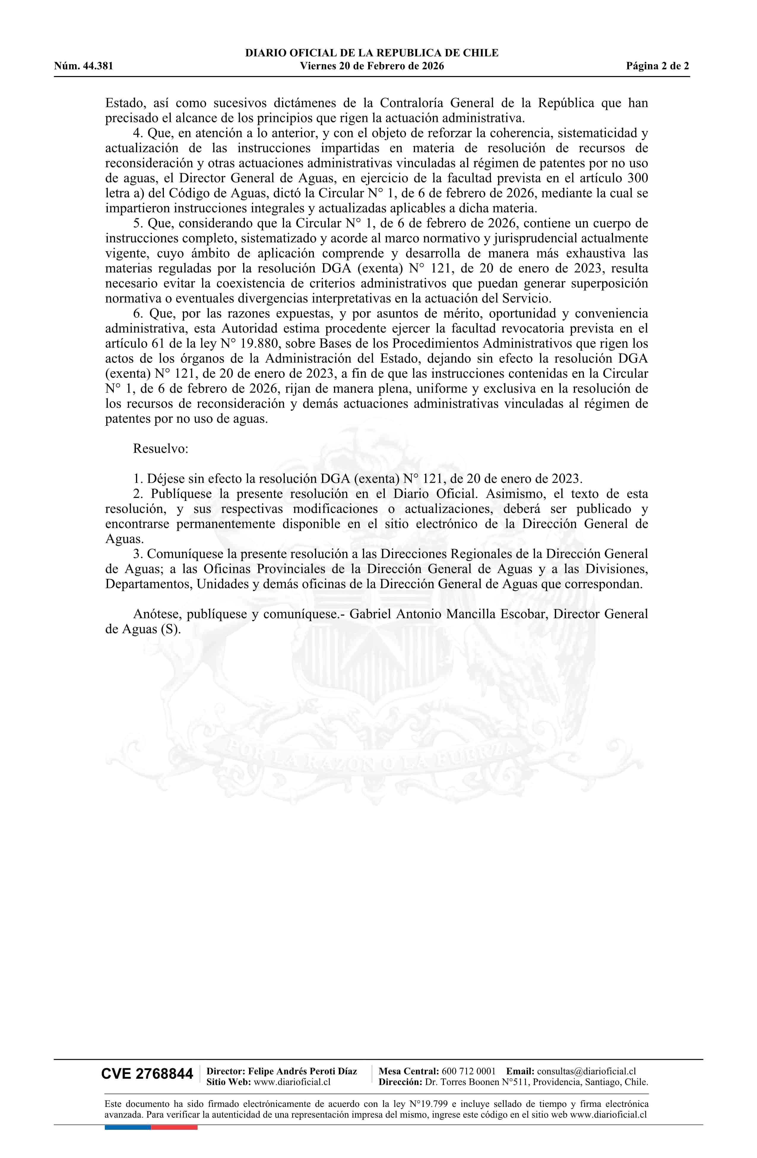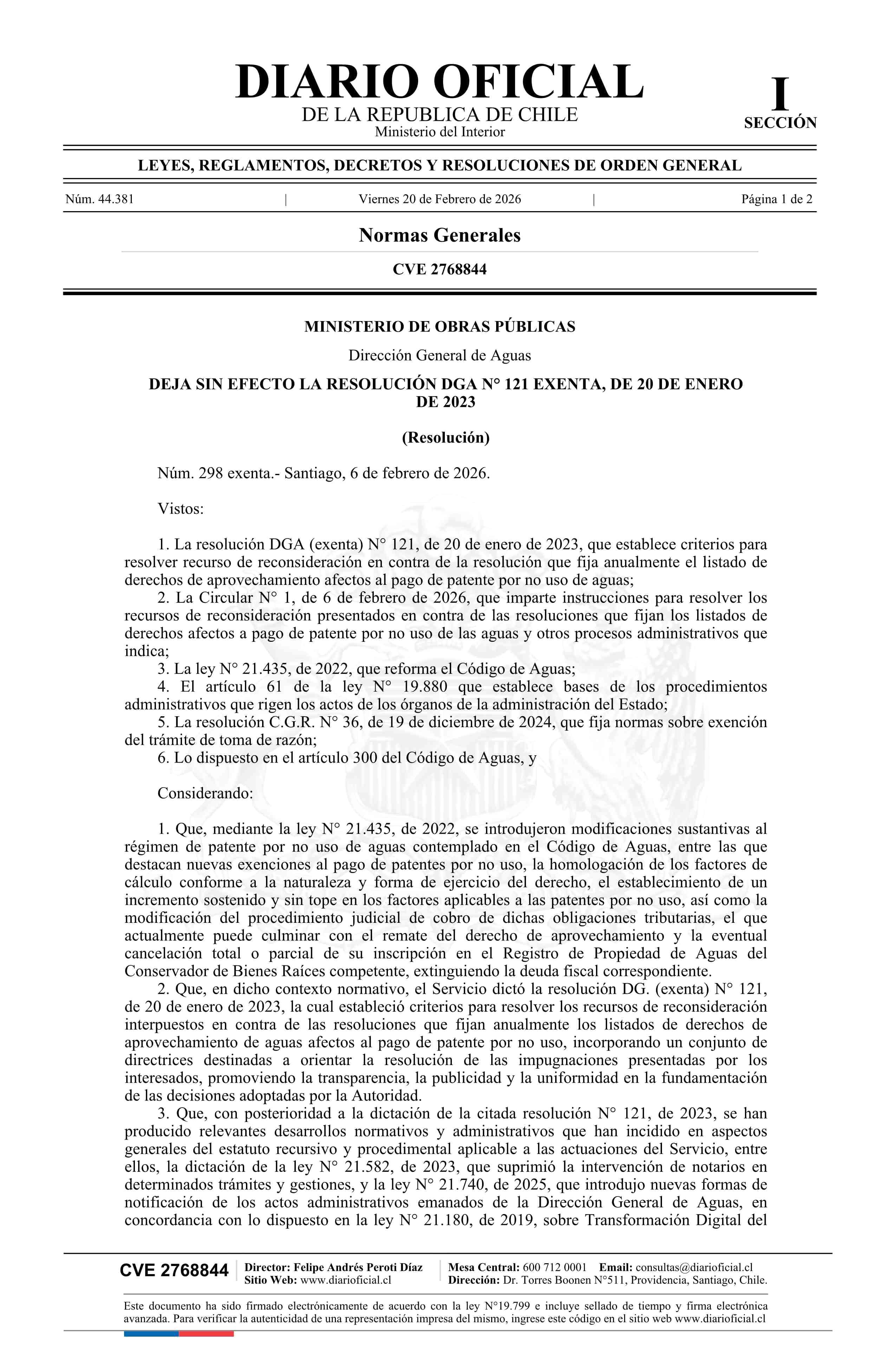 Resolución exenta número 298, de 2026.- Deja sin efecto resolución N° 121 exenta, de 2023 20-02-2026 Diario Oficial Edición Electrónica |