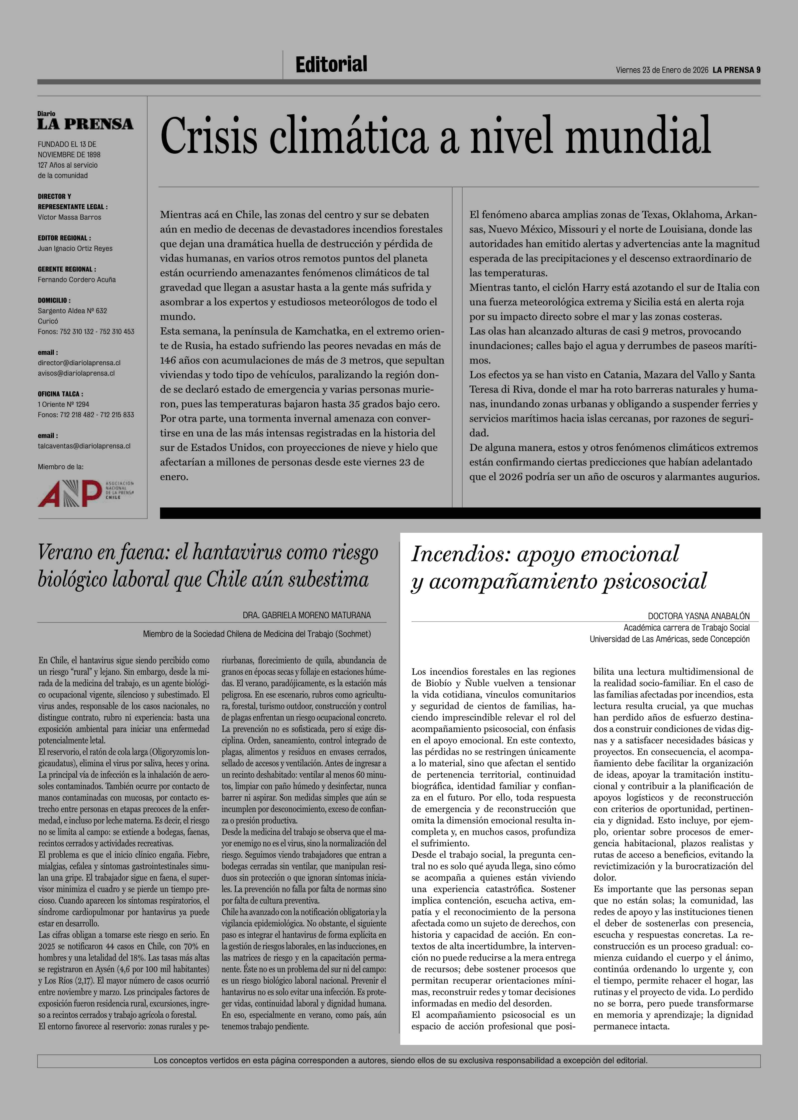 Cartas: Incendios: apoyo emocional y acompañamiento psicosocial 23-01-2026 La Prensa de Curicó |