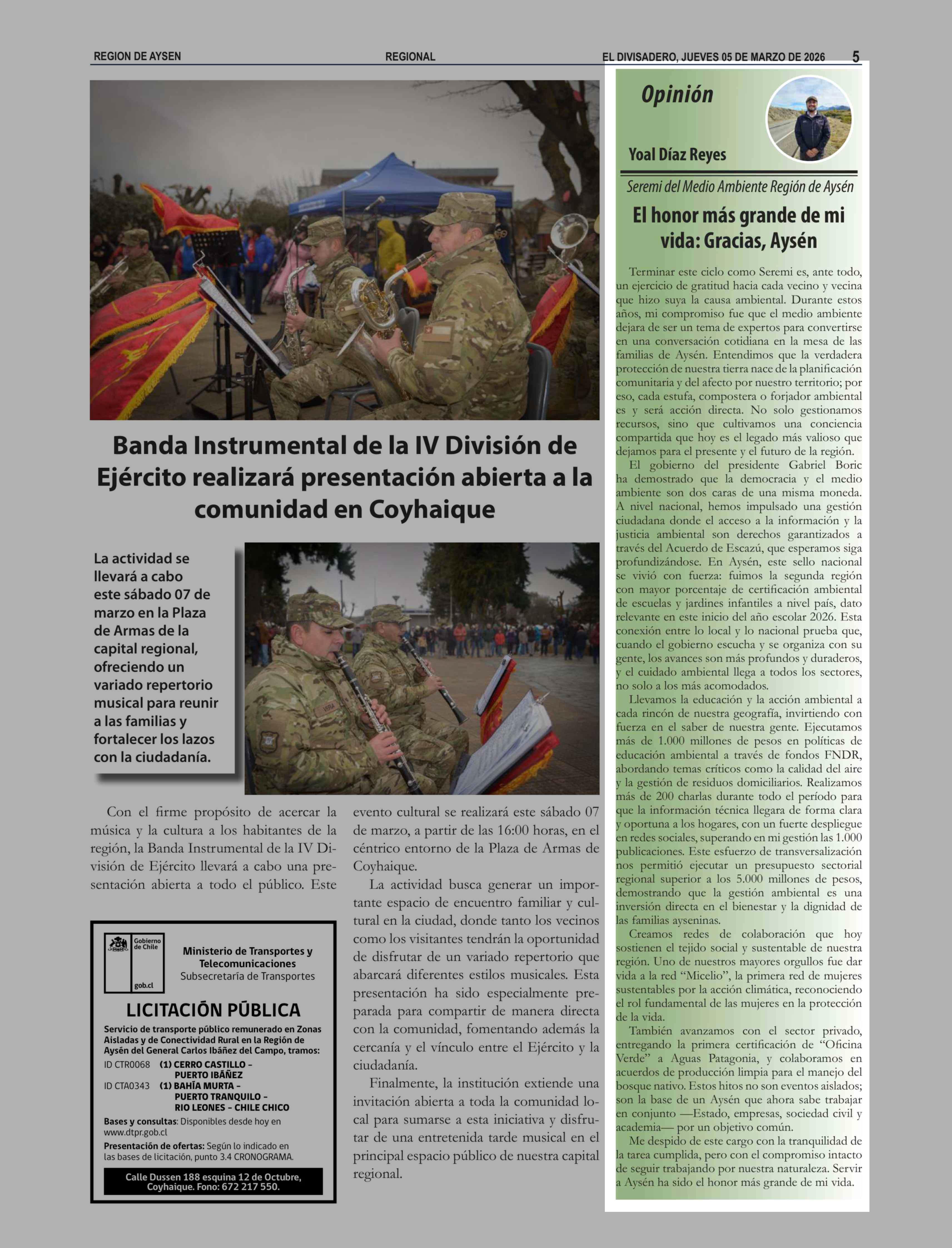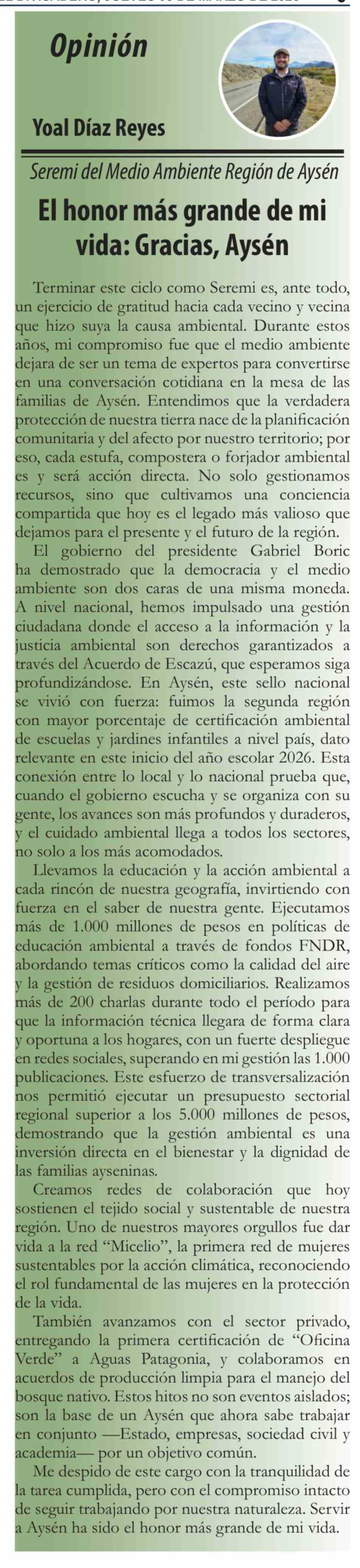 Columnas de Opinión: El honor más grande de mi vida: Gracias, Aysén 05-03-2026 El Divisadero |